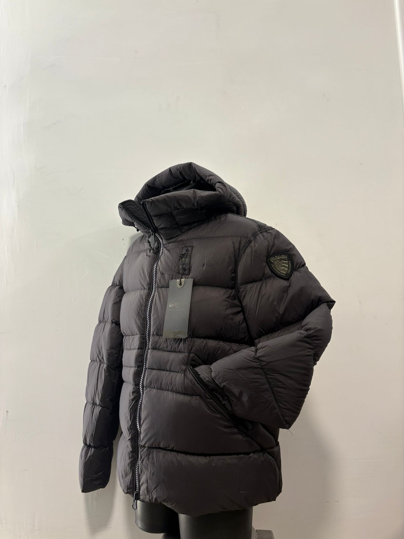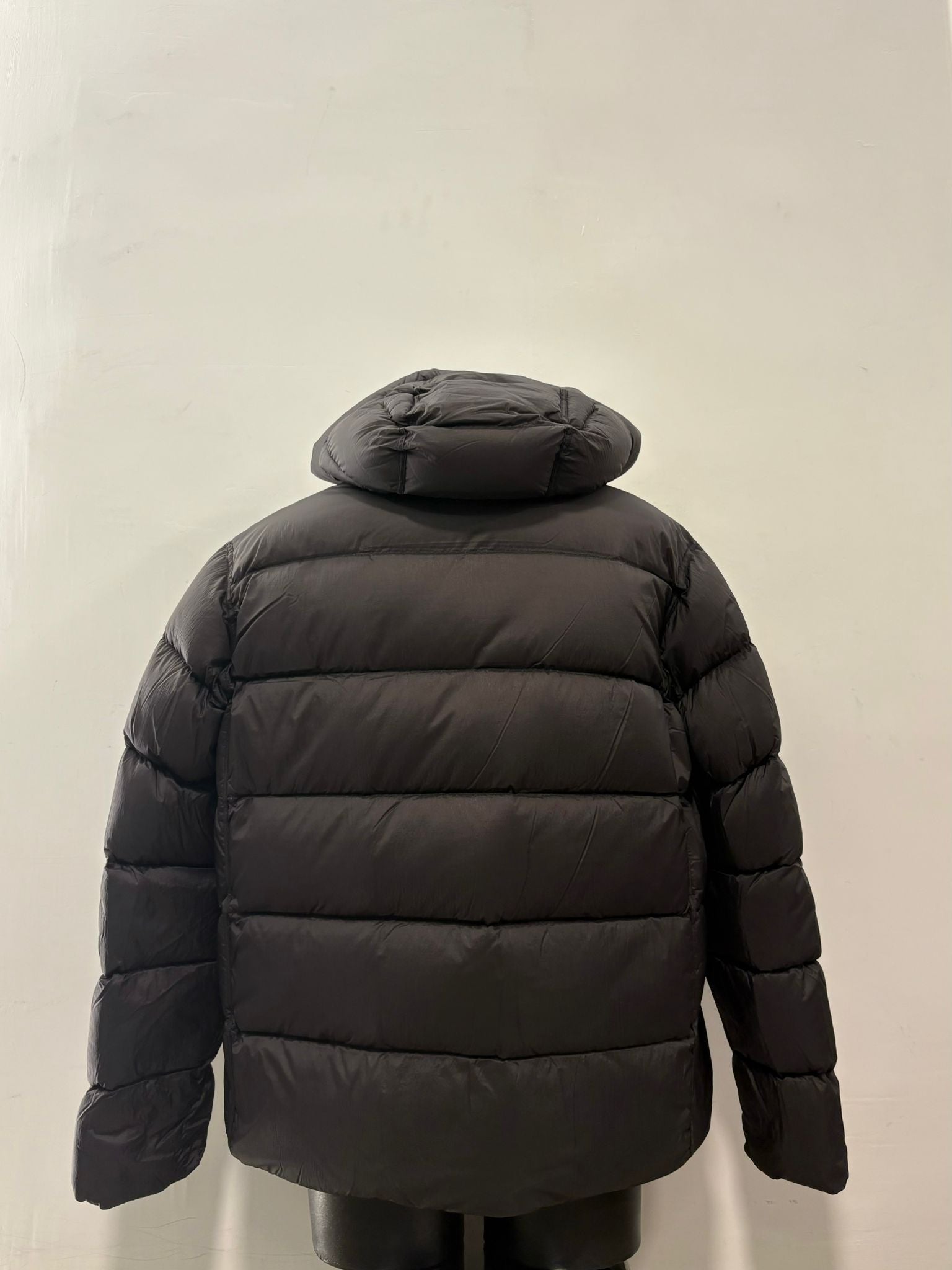 Piumino in nylon dall’effetto increspato per dare un effetto vissuto al capo. Imbottito in piuma e impunturato a linee orizzontali.