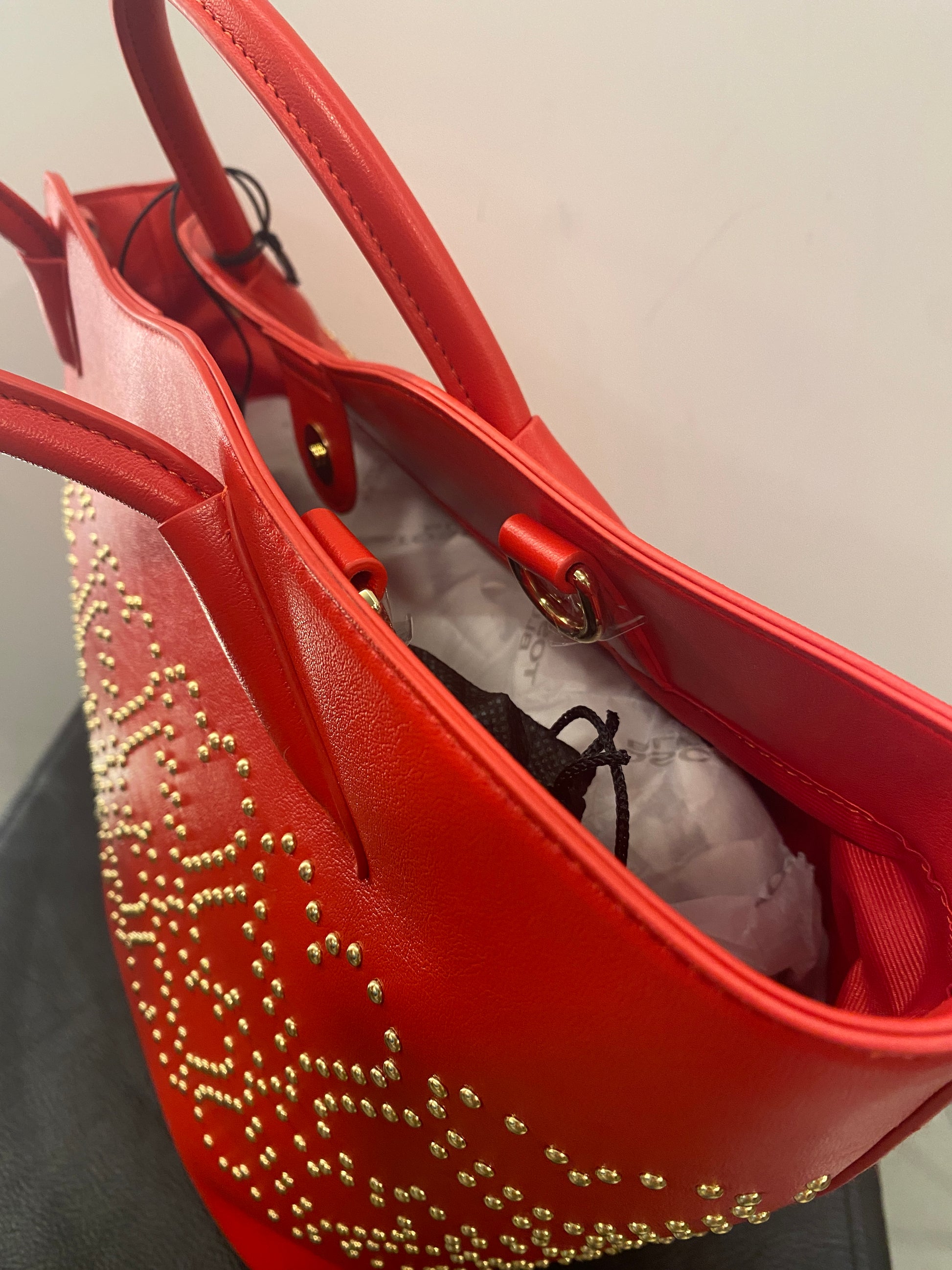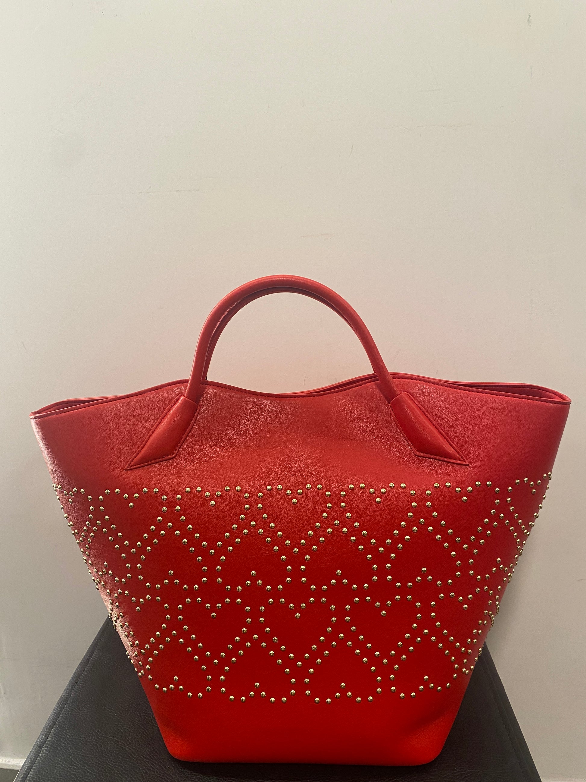Borsa rigida di Tosca Blu in vera pelle, decorata con piccole borchie color oro posizionate a creare un motivo geometrico che richiama dei cuori. Presenta due manici rigidi e una tracolla. chiusura con bottone magnetico.