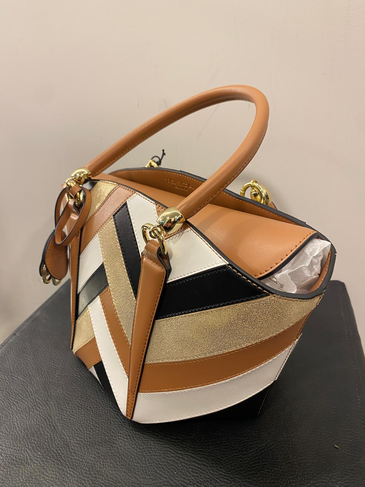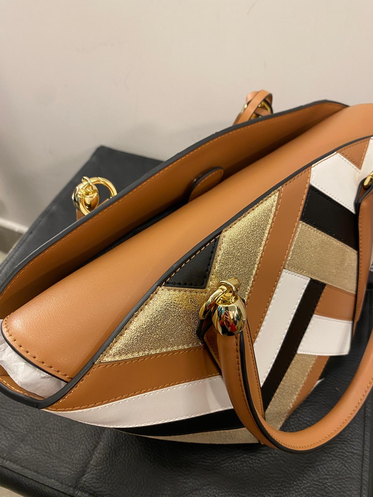 Borsa in pelle dalle linee pulite e geometriche con chiusura a bottone magnetico. Ha due manici corti e rigidi ed è dotata di una tracolla; finiture dorate come anelli, ganci e decorazione pendente, motivo decorativo geometrico.