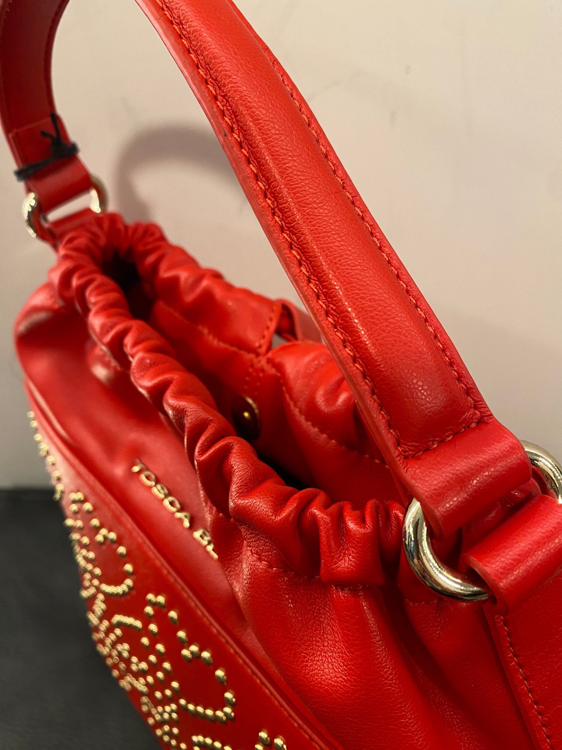 Borsa a secchiello semi-rigida in vera pelle, chiusura a coulisse e bottone magnetico; manico corto e rigido, a disposizione anche la tracolla. Decorazioni con piccole borchie metalliche color ora che formano motivi ripetuti a forma cuore.