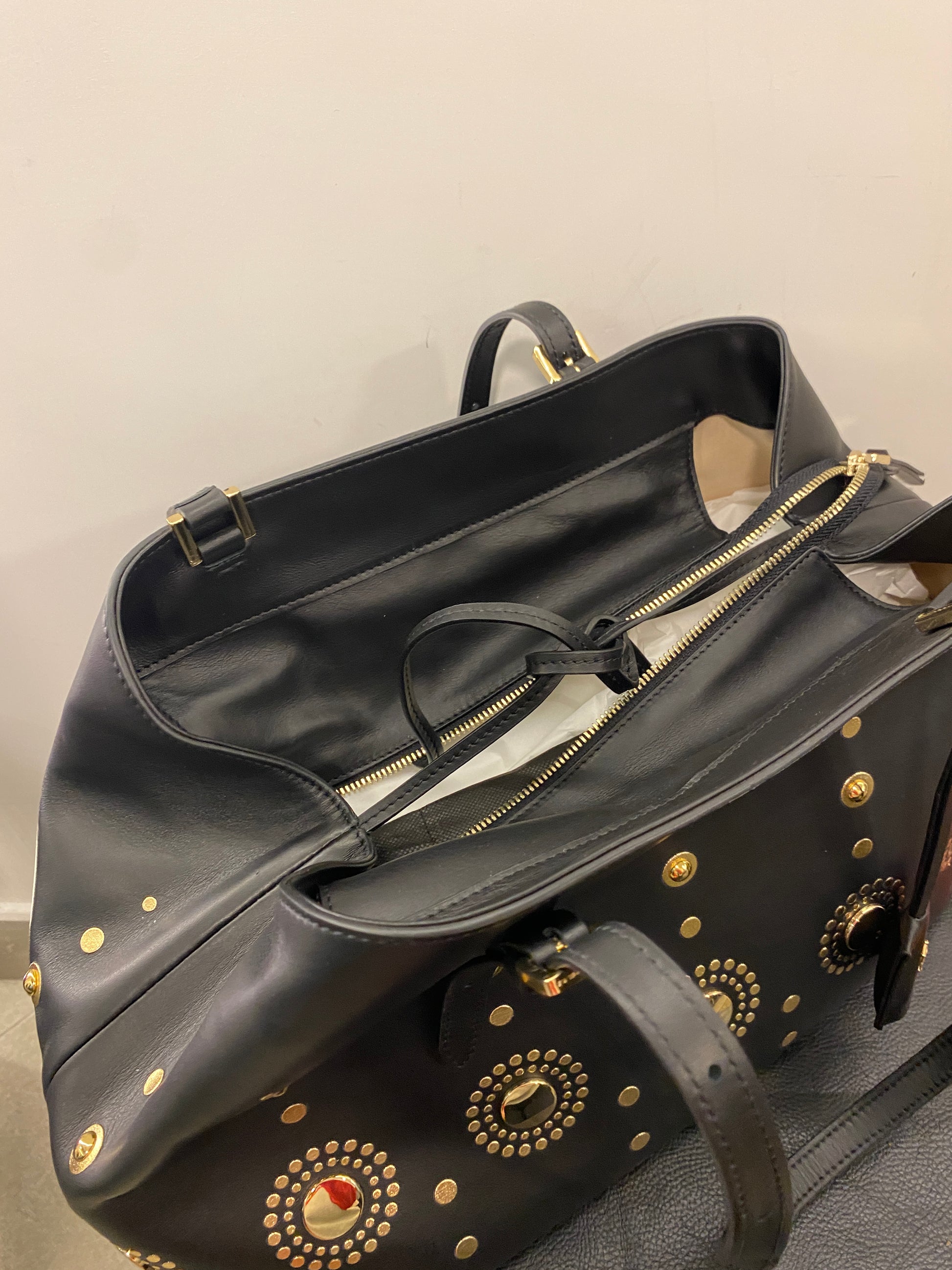 Borsa ampia a forma rettangolare, in vera pelle con chiusura a zip e lacci. Dotata di due manici corti; decorazioni con borchie metalliche oro disposte in motivi circolari.