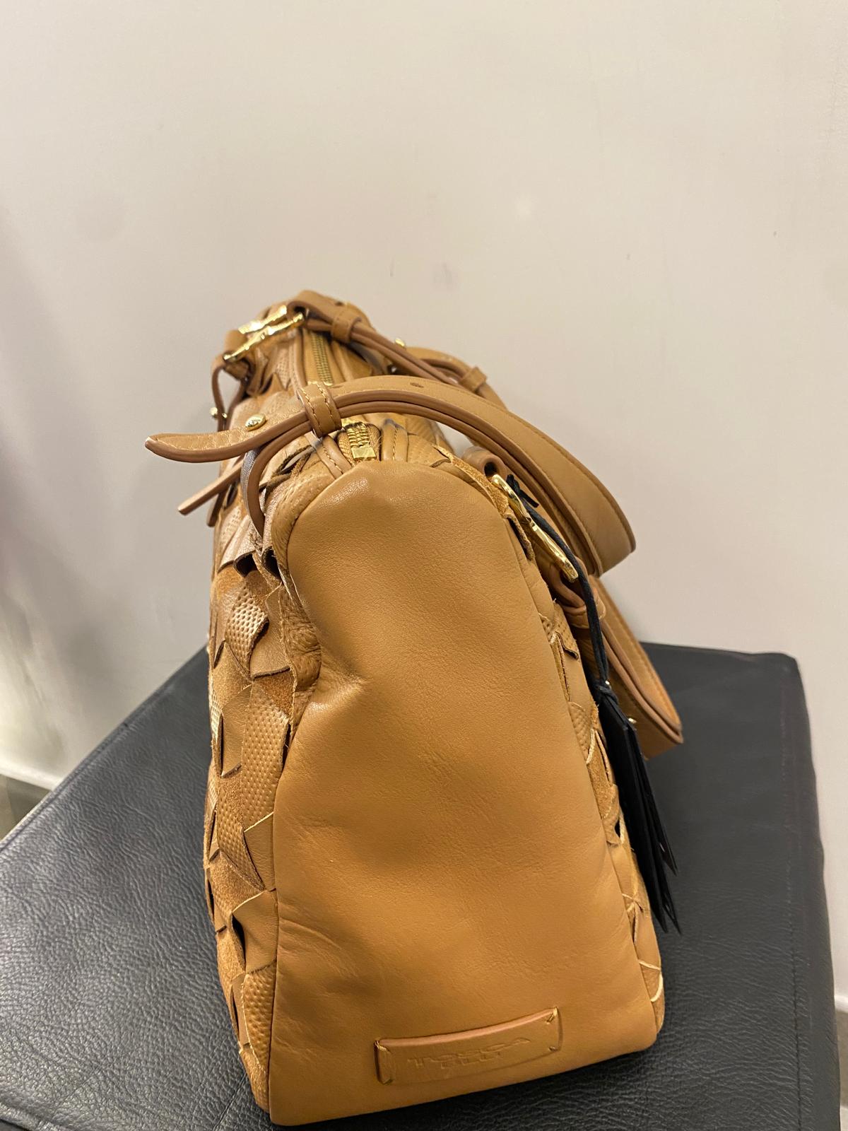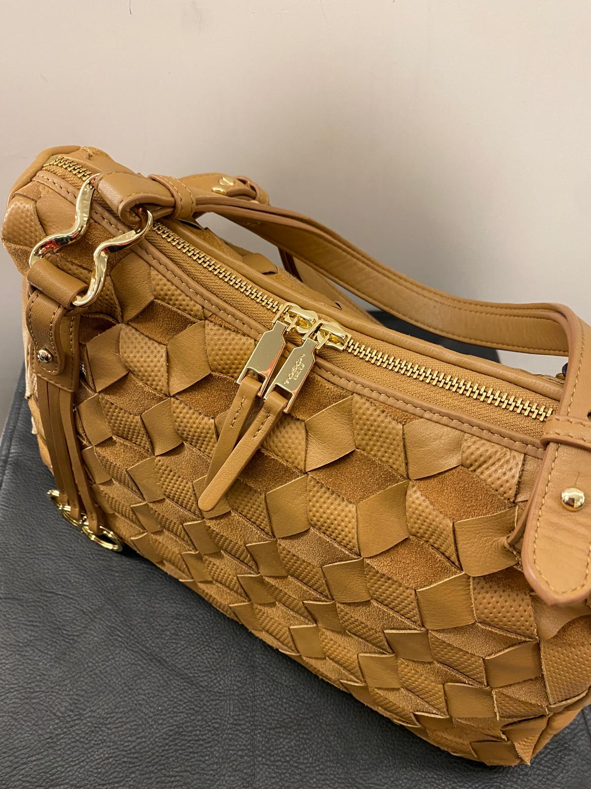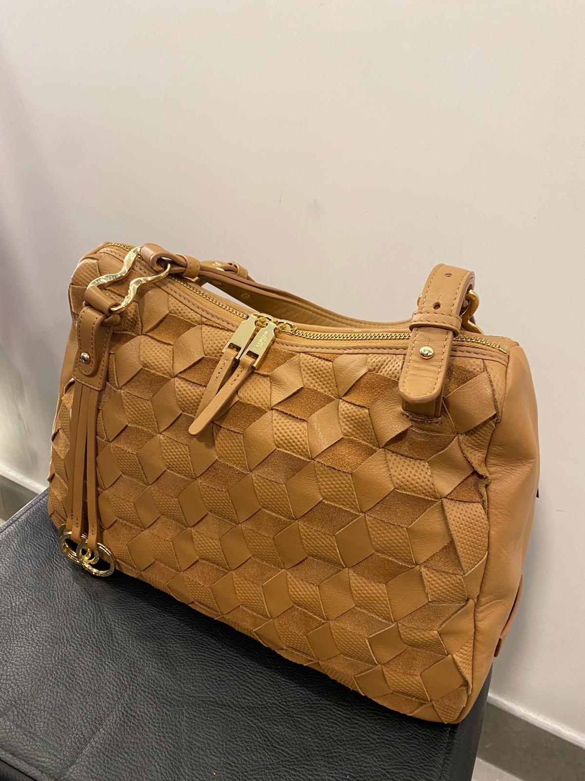 Borsa a spalla di grandi dimensioni in vera pelle con una forma allungata e leggermente arrotondata. L'elemento centrale è il motivo geometrico a rilievo creato sulla pelle. Chiusura con cerniera dotata di due manici.