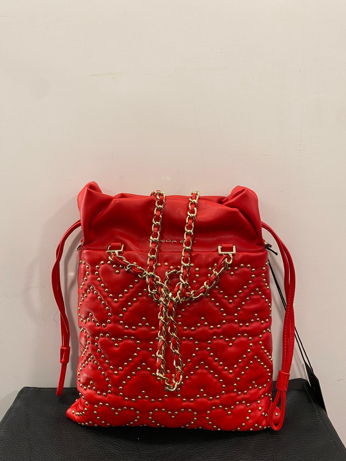 Borsa a secchiello in vera pelle caratterizzata da piccole borchie che danno la forma di un cuore. Borsa con manici metallici e tracolla con chiusura a bottone magnetico e coulisse