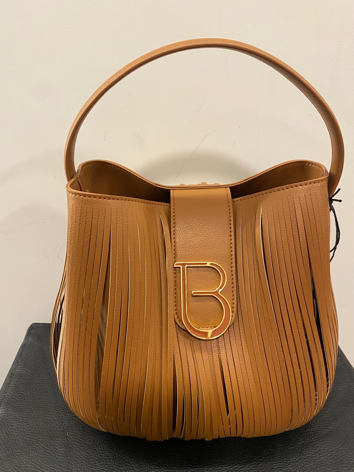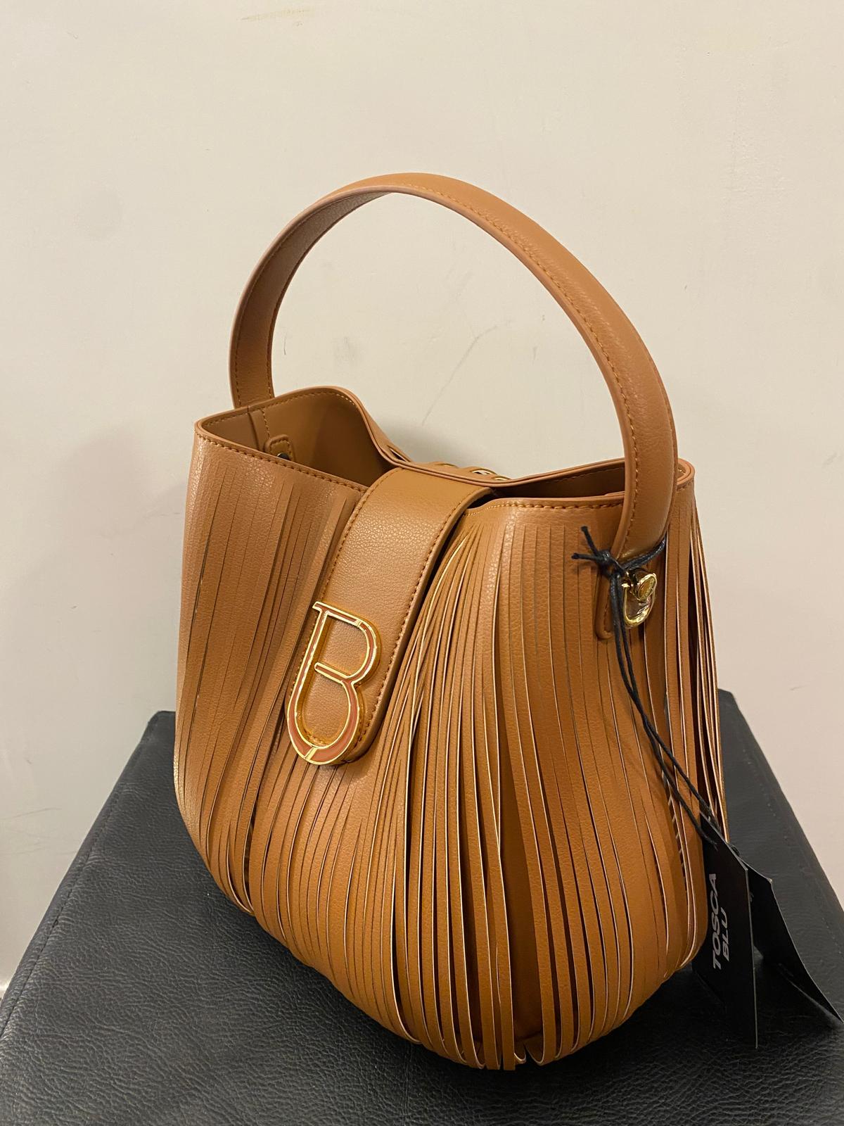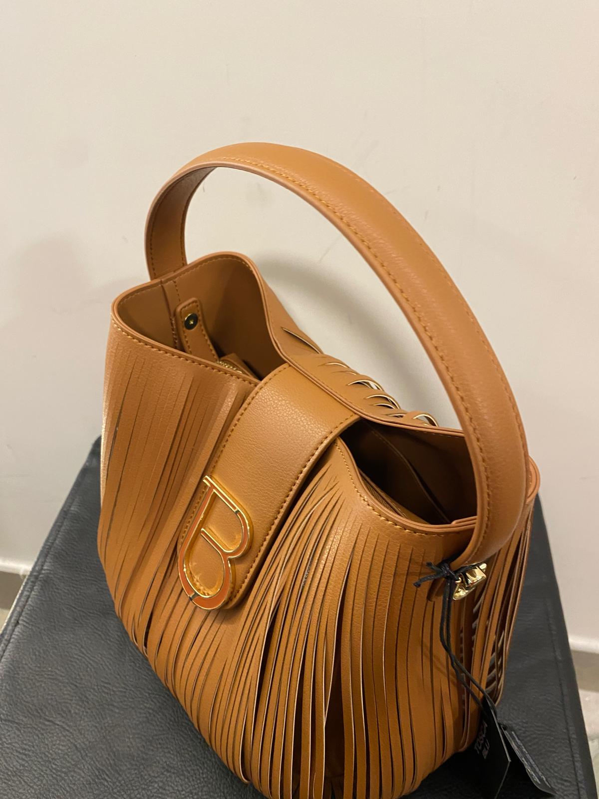 Borsa a secchiello di medie dimensioni in similpelle, forma cilindrica e strutturata alla base. Frange decorative dello stesso materiale come rivestimento. chiusura con fascetta magnetica. dotato di un manico singolo e ampio.