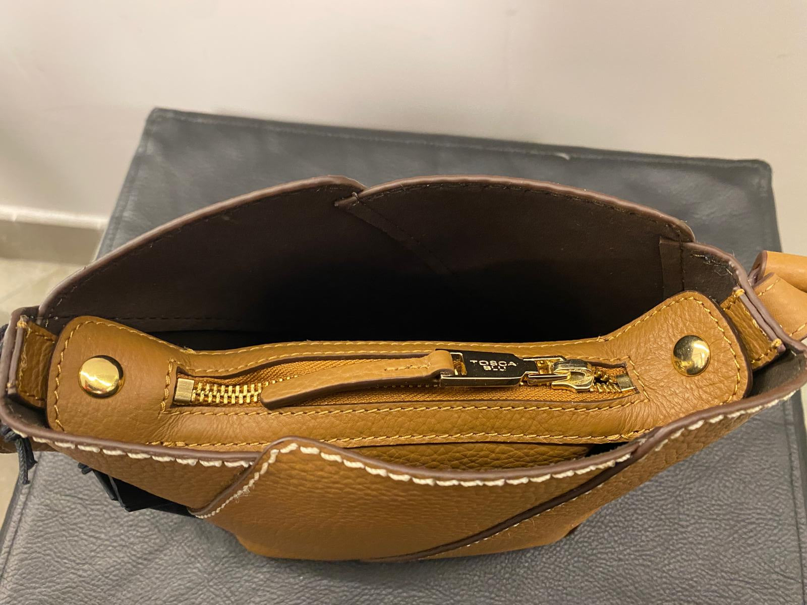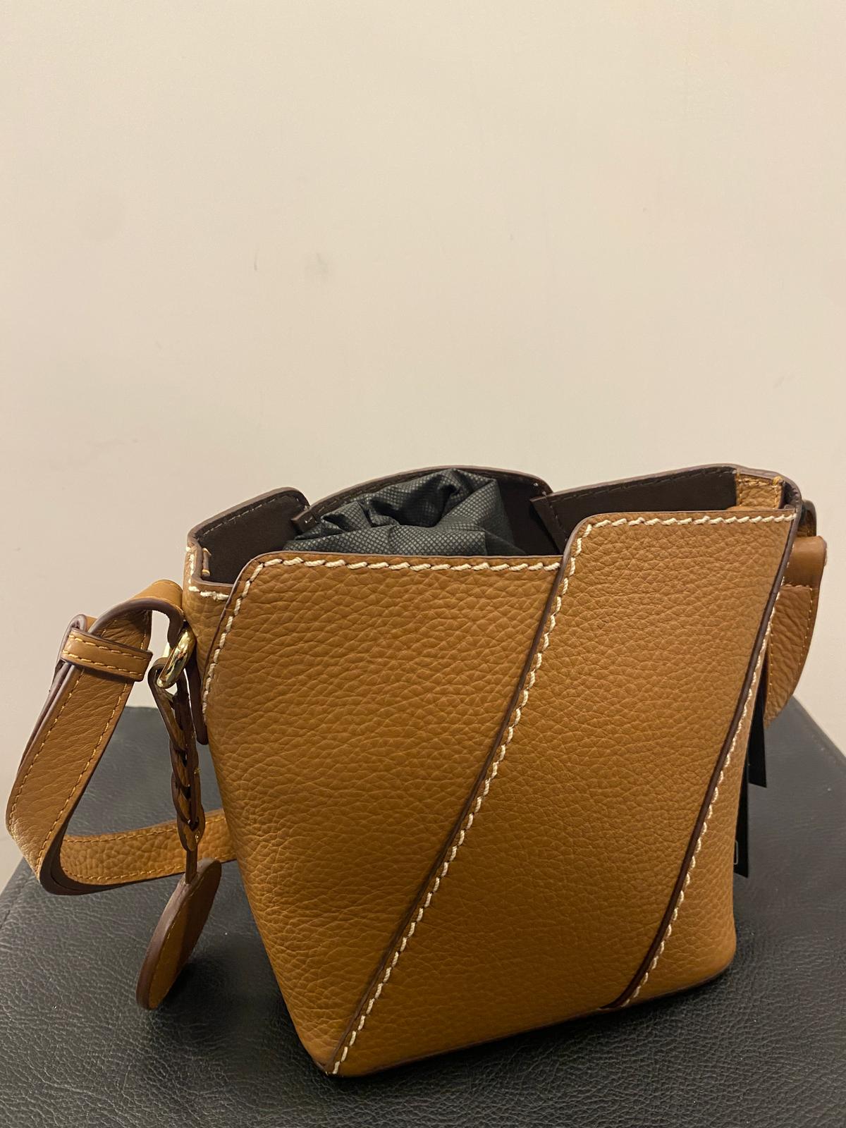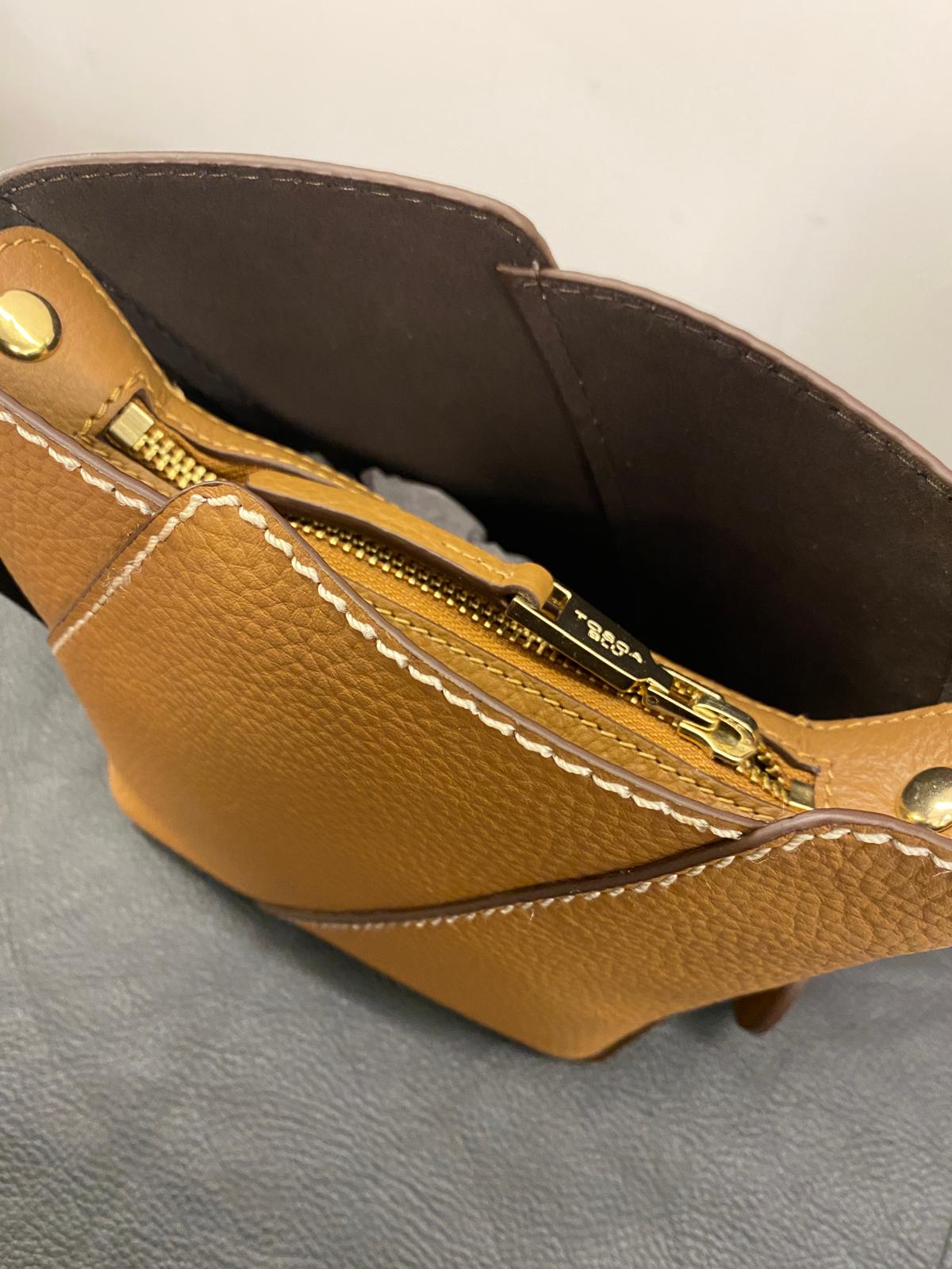 Borsa in vera pelle, dalla forma particolare, strutturata e geometrica con angoli netti. Cuciture a vista in contrasto che marcano i tagli e le giunture della pelle posizionate in diagonale che creano un disegno moderno e sofisticato. La borsa ha un'apertura superiore ampia e squadrata con una chiusura a zip nella tasca interna.
