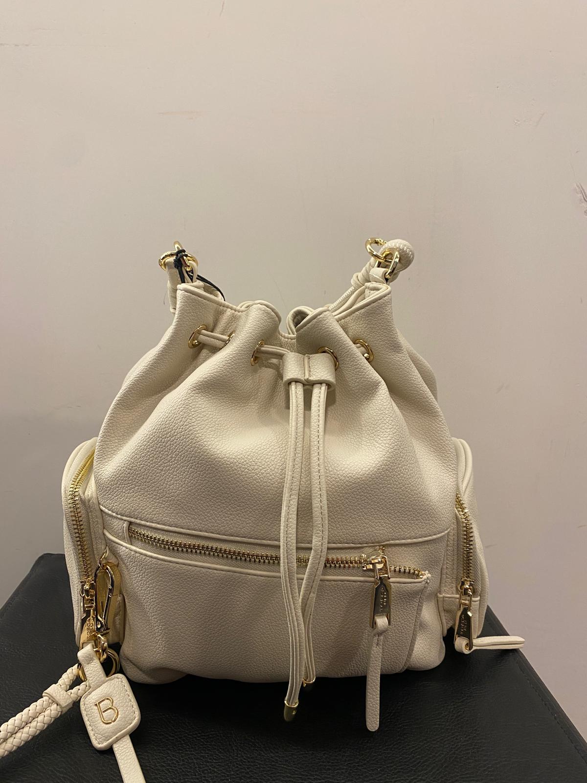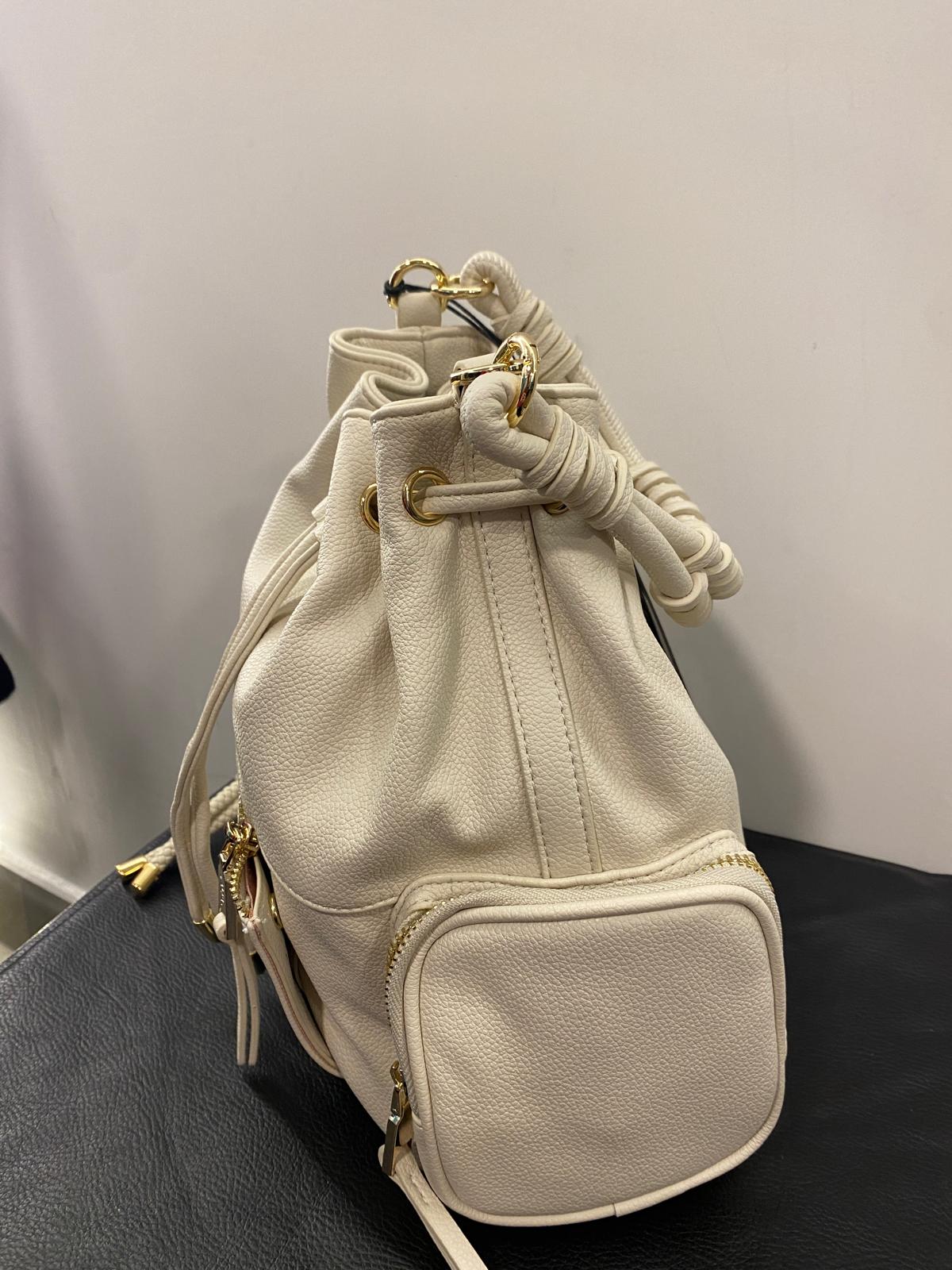 Borsa a secchiello in vera pelle con una struttura laterale arricchiata. Dotata di tasche esterne con chiusura in zip come decorazione. chiusura tradizionale del secchiello, i fori per la coulisse sono rinforzati con occhielli dorati. Manico realizzato con una lavorazione ad intreccio.