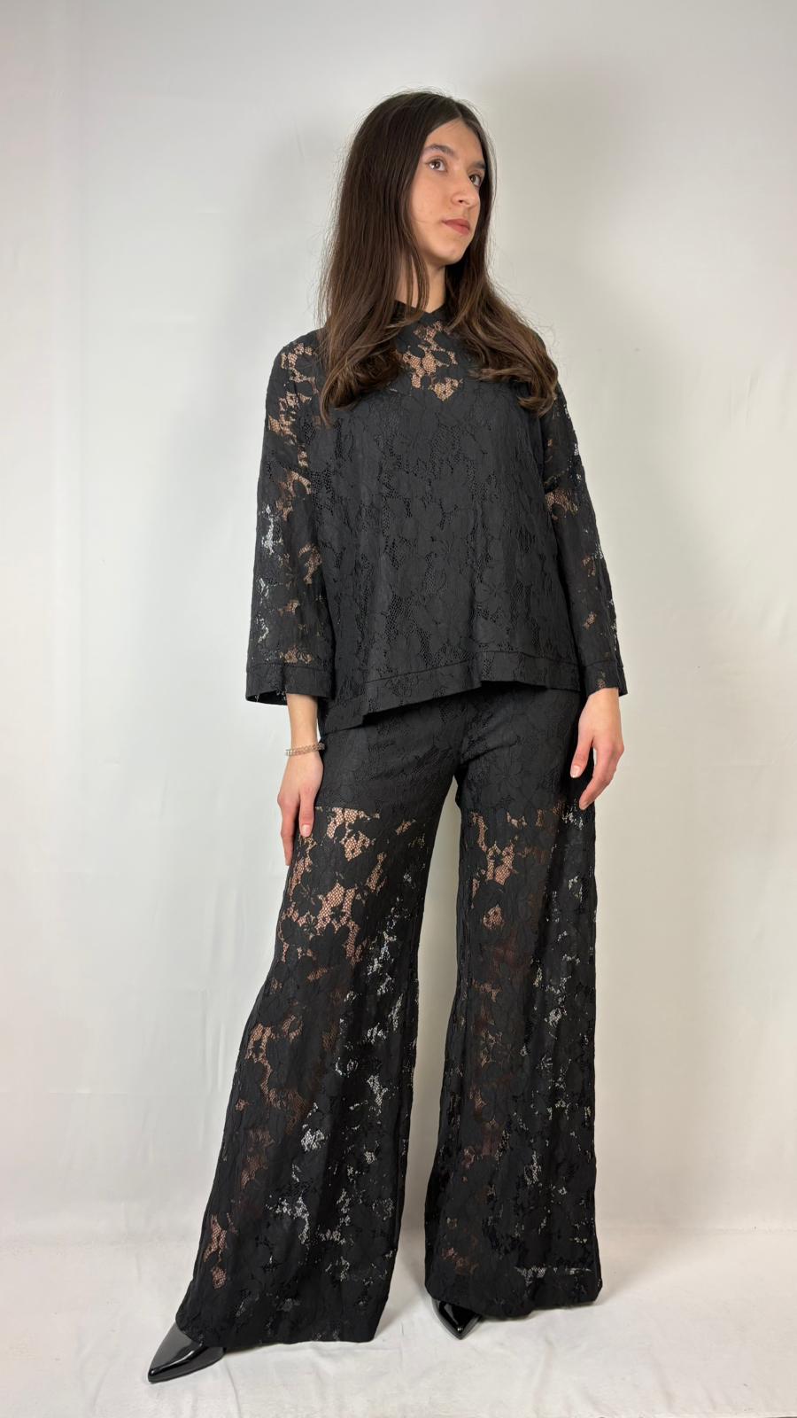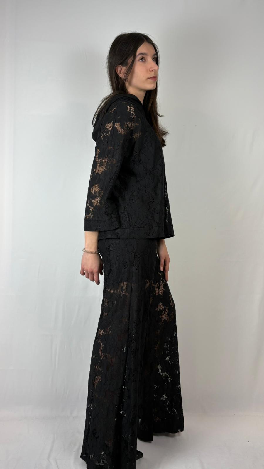 Presenta maniche a 3/4 dal taglio ampio e un cappuccio integrato che aggiunge un tocco urbano al delicato pizzo, il capo è caratterizzato da un raffinato gioco di trasparenze, reso perfettamente indossabile grazie alla presenza di uno strato interno che copre le zone strategiche, garantendo comfort e discrezione senza sacrificare la bellezza del pizzo. Il pizzo presenta un ricamo floreale dettagliato e materico che conferisce profondità e lusso all'intero outfit.