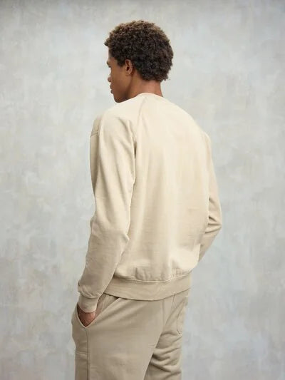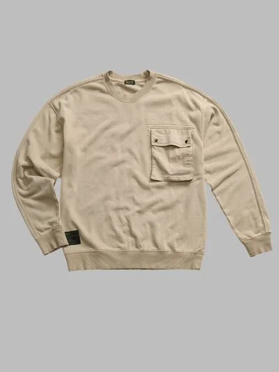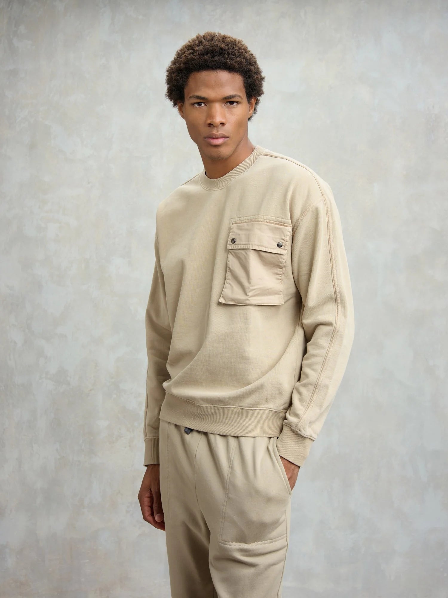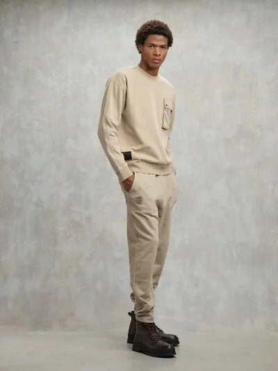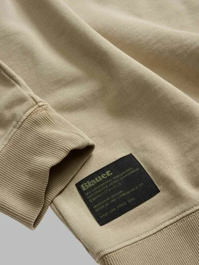 Felpa girocollo chiusa davanti. Costina rigata sul girocollo, sui polsini e sul fondo. Tasca a soffietto sul petto e fettuccia in cotone a decoro lungo le cuciture delle maniche e del giro manica.
