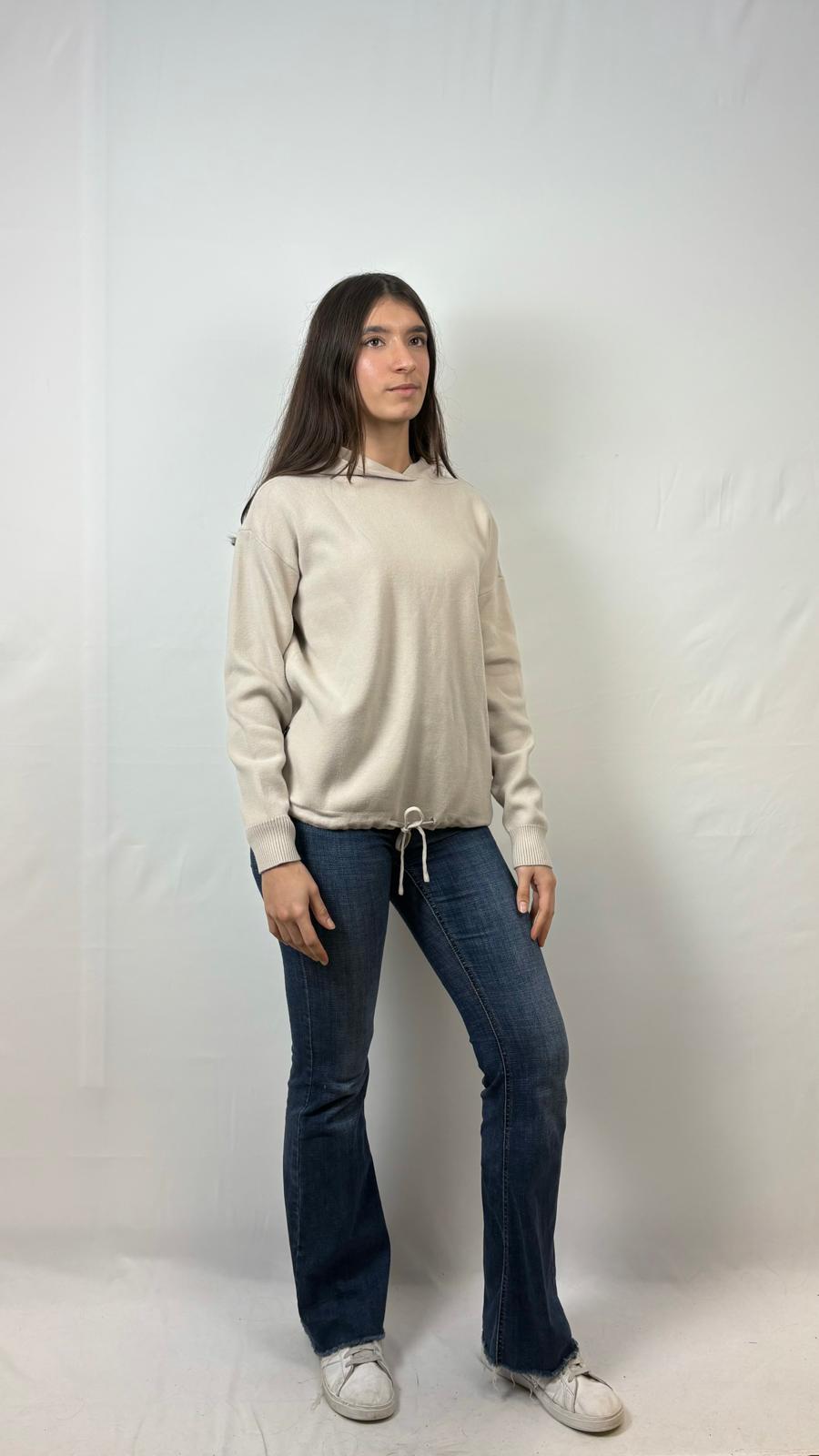 Maglia con cappuccio fisso, chiusa sul davanti, in tessuto morbido e confortevole. La coulisse sul fondo permette di portare la maglia arricciata sul fondo.