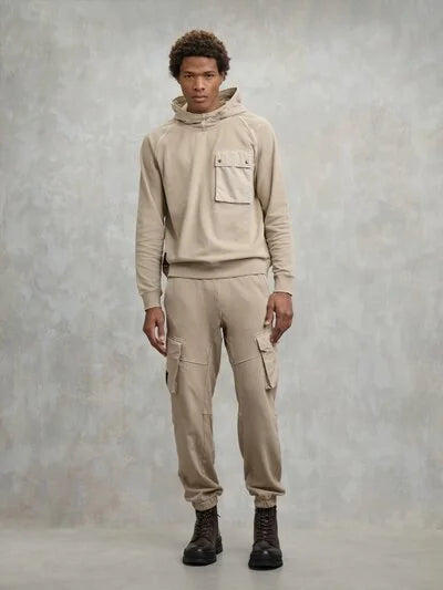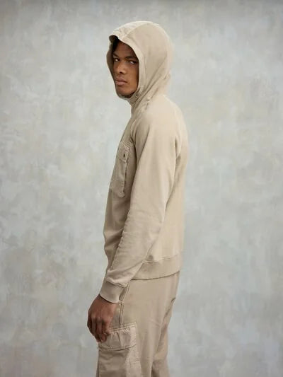 Felpa dal collo alto e con cappuccio chiusa sul davanti. Costina rigata sui polsini e sul fondo. Tasca a soffietto sul petto. Decoro in contrasto colore nel cappuccio nella taschina e nella fettuccia del giro manica.