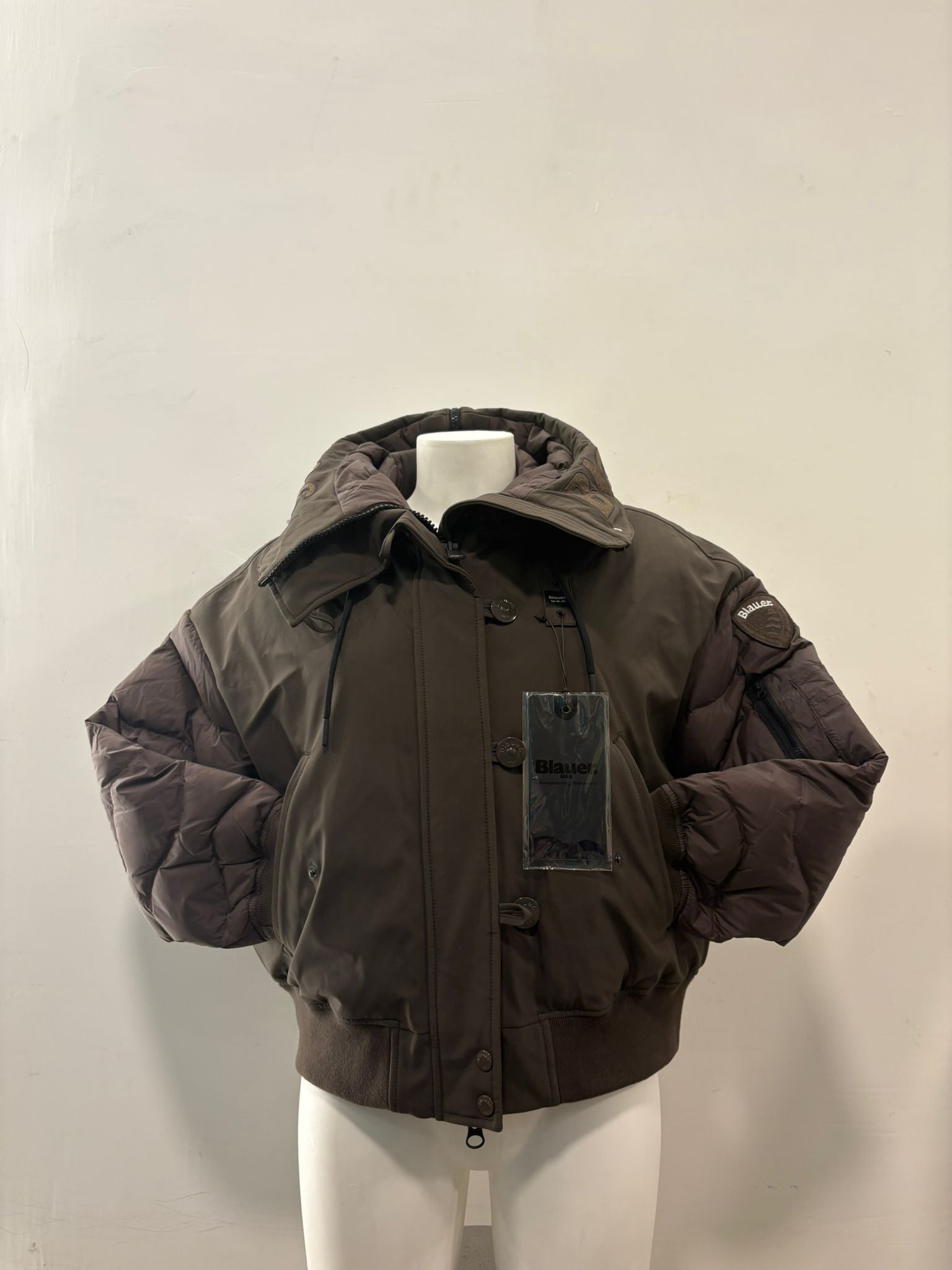 Piumino bomber ad ispirazione militare ma con tocco fashion, adatto ad una donna decisa e sicura. Realizzato in neoprene su corpo e cappuccio e lucido in nylon sulle maniche.