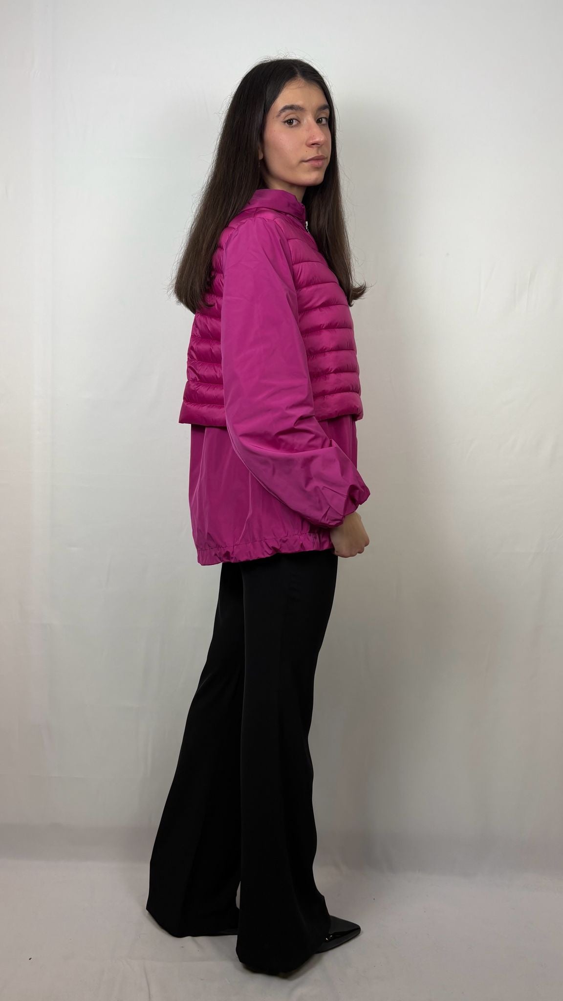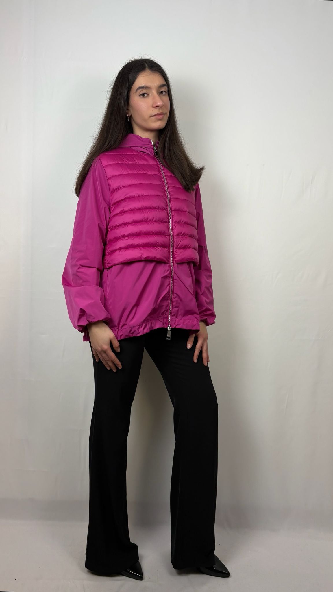 Il pannello frontale e posteriore superiore presentano una trapuntatura orizzontale imbottita per proteggere dal freddo, mentre le maniche e la parte inferiore sono realizzate in tessuto tecnico liscio e fluido. Il design posteriore crea un sofisticato effetto a strati sovrapposti, donando movimento e un tocco di originalità alla silhouette. Dotata di un ampio cappuccio integrato e regolabile, perfetto per affrontare improvvisi sbalzi di temperatura o piogge leggere. La vestibilità ampia è accompagnata da un fondo elasticizzato che permette di regolare il volume della giacca, adattandola al proprio stile. Chiusura a zip integrale con doppio cursore in metallo cromato, che permette un'apertura personalizzata sia dall'alto che dal basso.