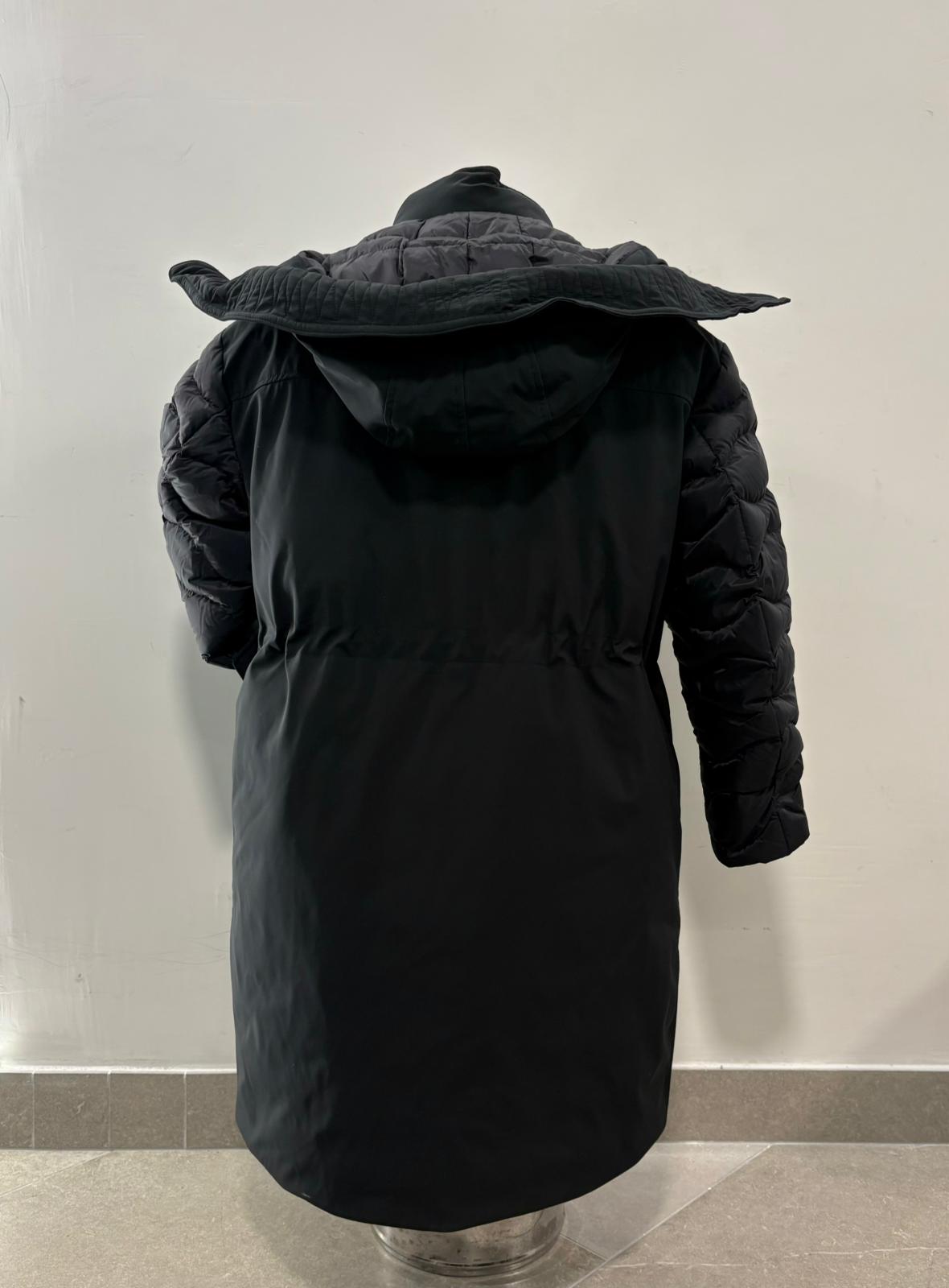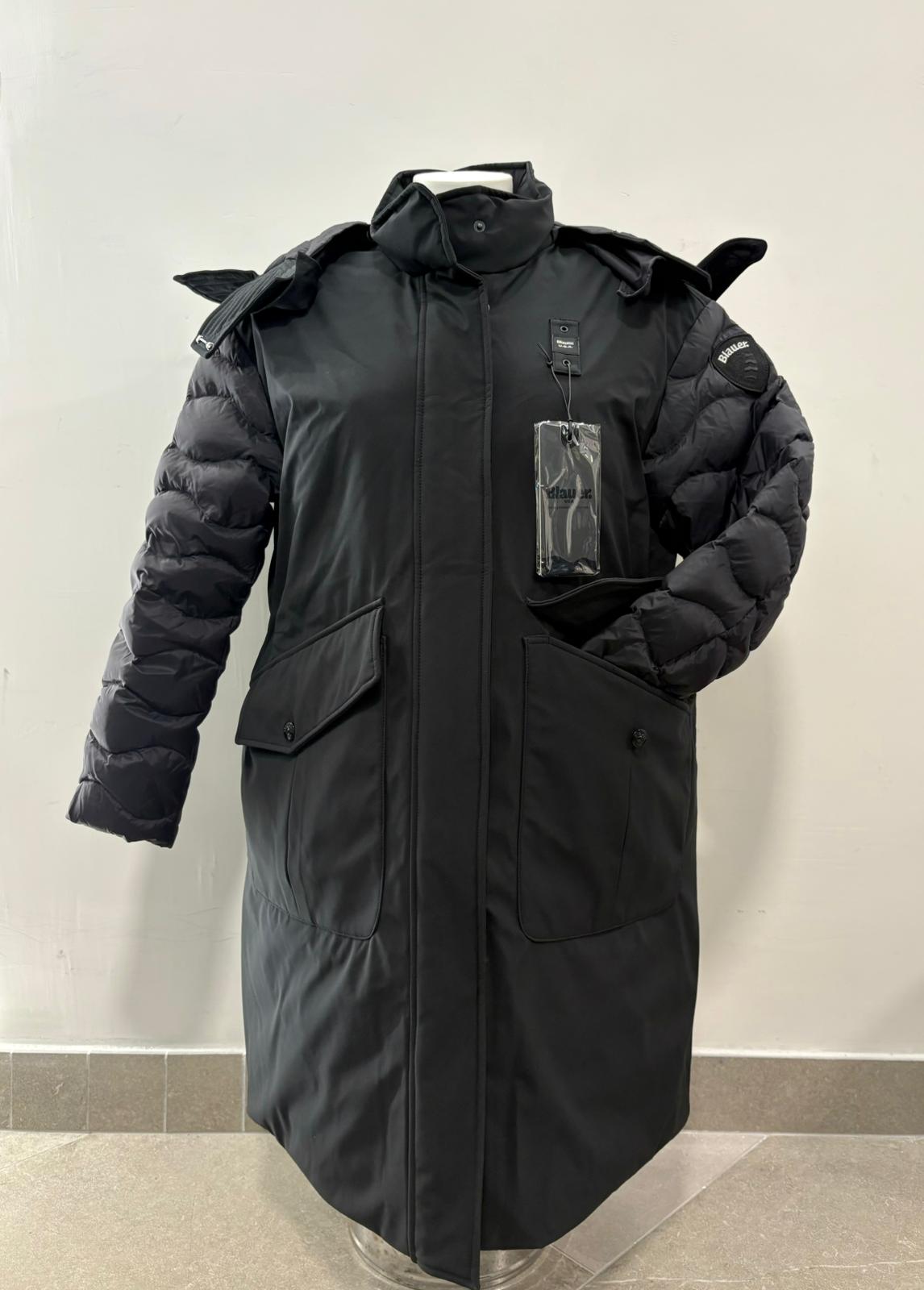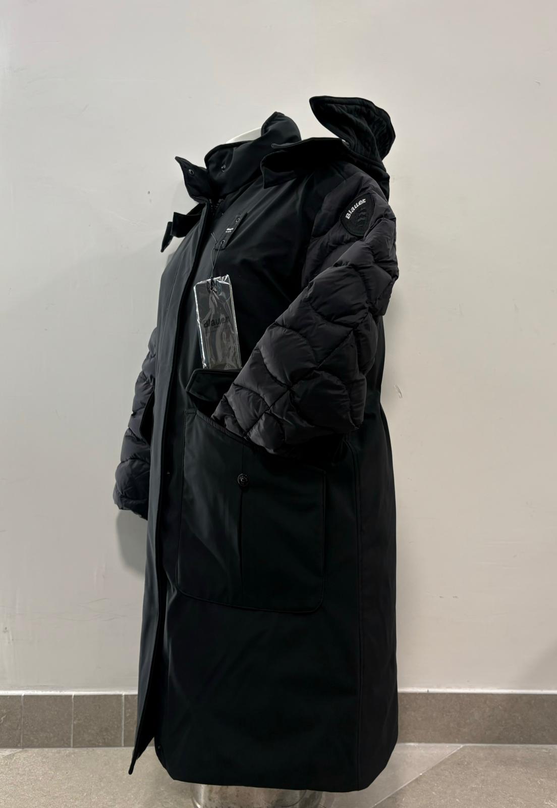 Parka lungo in neoprene liscio idrorepellente con cappuccio fisso. Imbottitura mista che unisce comfort e calore. Capo iconico Blauer ad inspirazione militare.