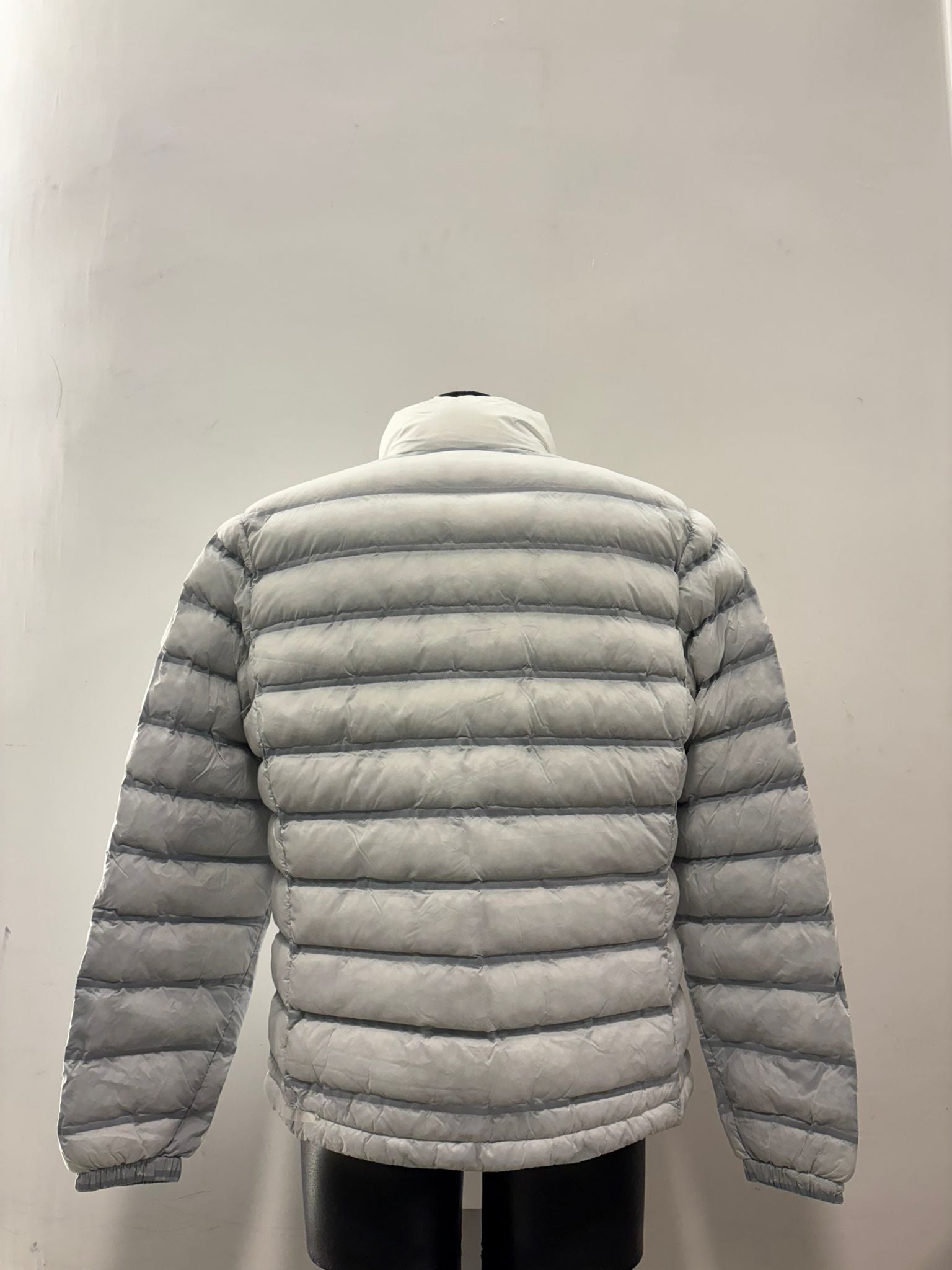 Giubbetto con cuciture termosaldate a righe orizzontali. Imbottitura leggera ed ecologica realizzata del riciclo di bottiglie di plastica.