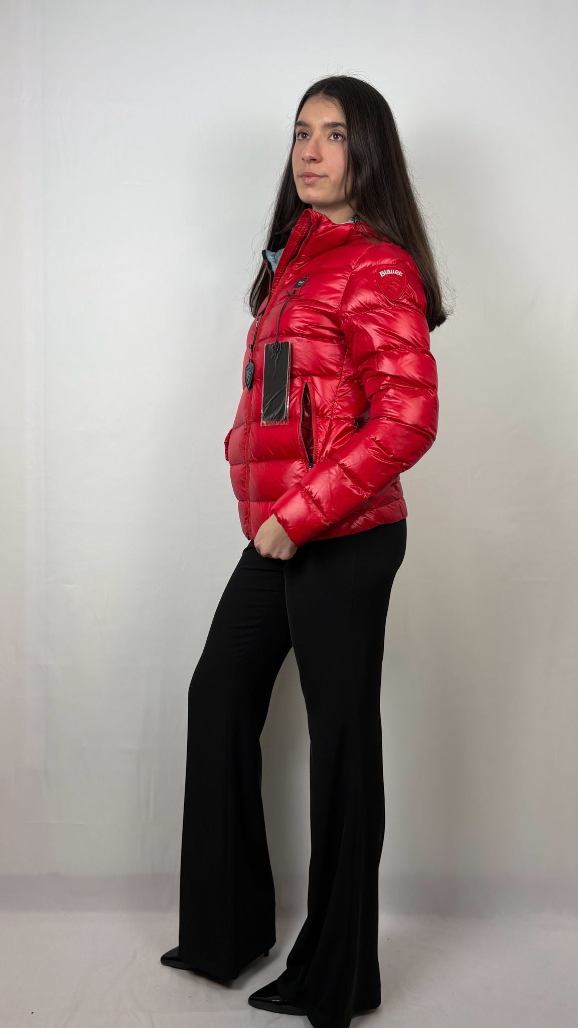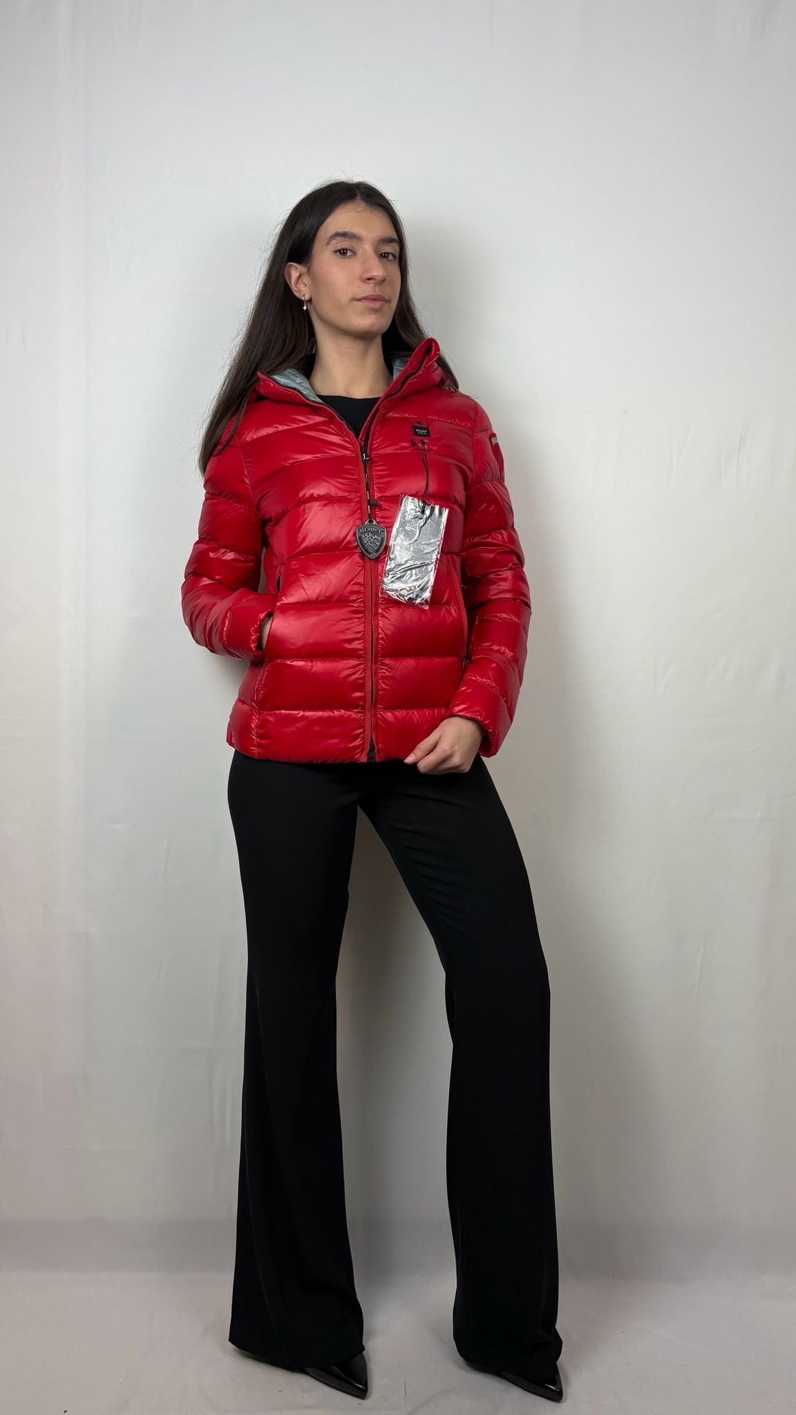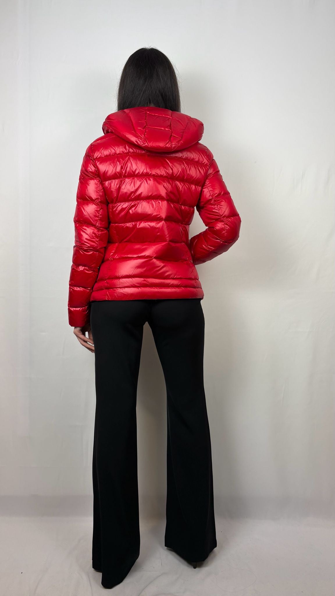 Il tessuto esterno rosso vibrante presenta una finitura lucida che respinge l’umidità e dona un tocco glam-sporty. L'imbottitura trapuntata a boudin orizzontali è progettata per offrire un isolamento termico ottimale mantenendo un profilo sottile e leggero. L'interno è rifinito in una raffinata tonalità grigio perla metallizzato, visibile quando la giacca è aperta, per un contrasto cromatico sofisticato. Presenta il patch logato sulla manica sinistra e un tirazip personalizzato che ne sottolineano l'autenticità e la cura nei dettagli. Dotato di un cappuccio integrato e avvolgente e tasche laterali con zip a scomparsa per proteggere le mani e i tuoi oggetti personali.