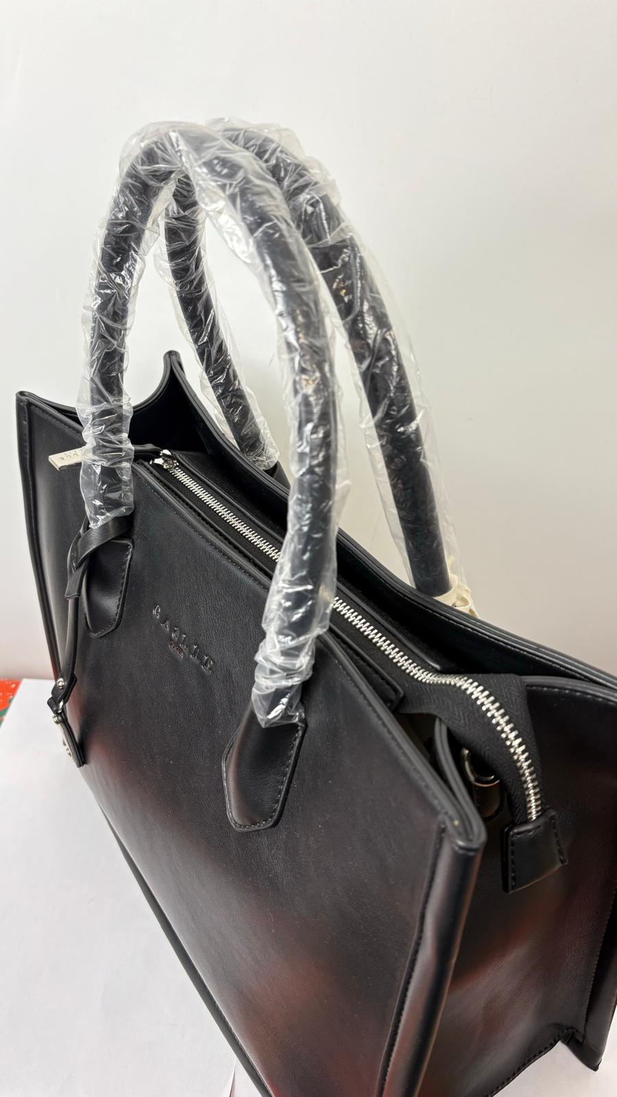 Una borsa "tote" ampia e rettangolare, dal look pulito ed essenziale in ecopelle nera opaca dalla grana molto fine. Logo metallico argentato "GAËLLE PARIS" centrato nella parte superiore. Manici lunghi e arrotondati, ideali per il porto a spalla, ha a disposizione anche una tracolla.