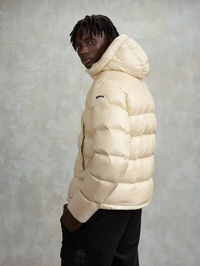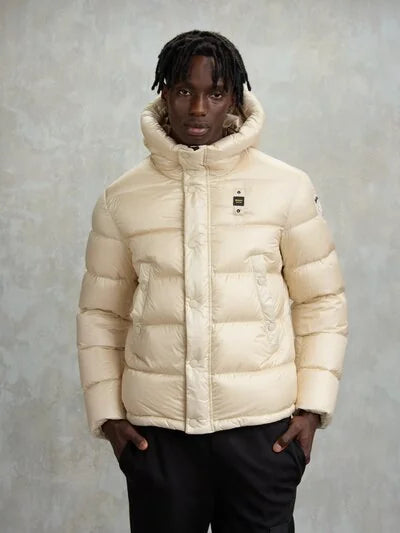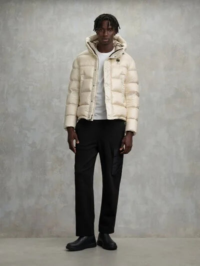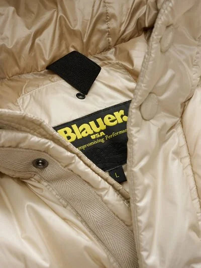 Piumino trapuntato a righe orizzontali ed interno in contrasto colore. Capo iconico Blauer con imbottitura naturale in piuma, calda e non ingombrante.