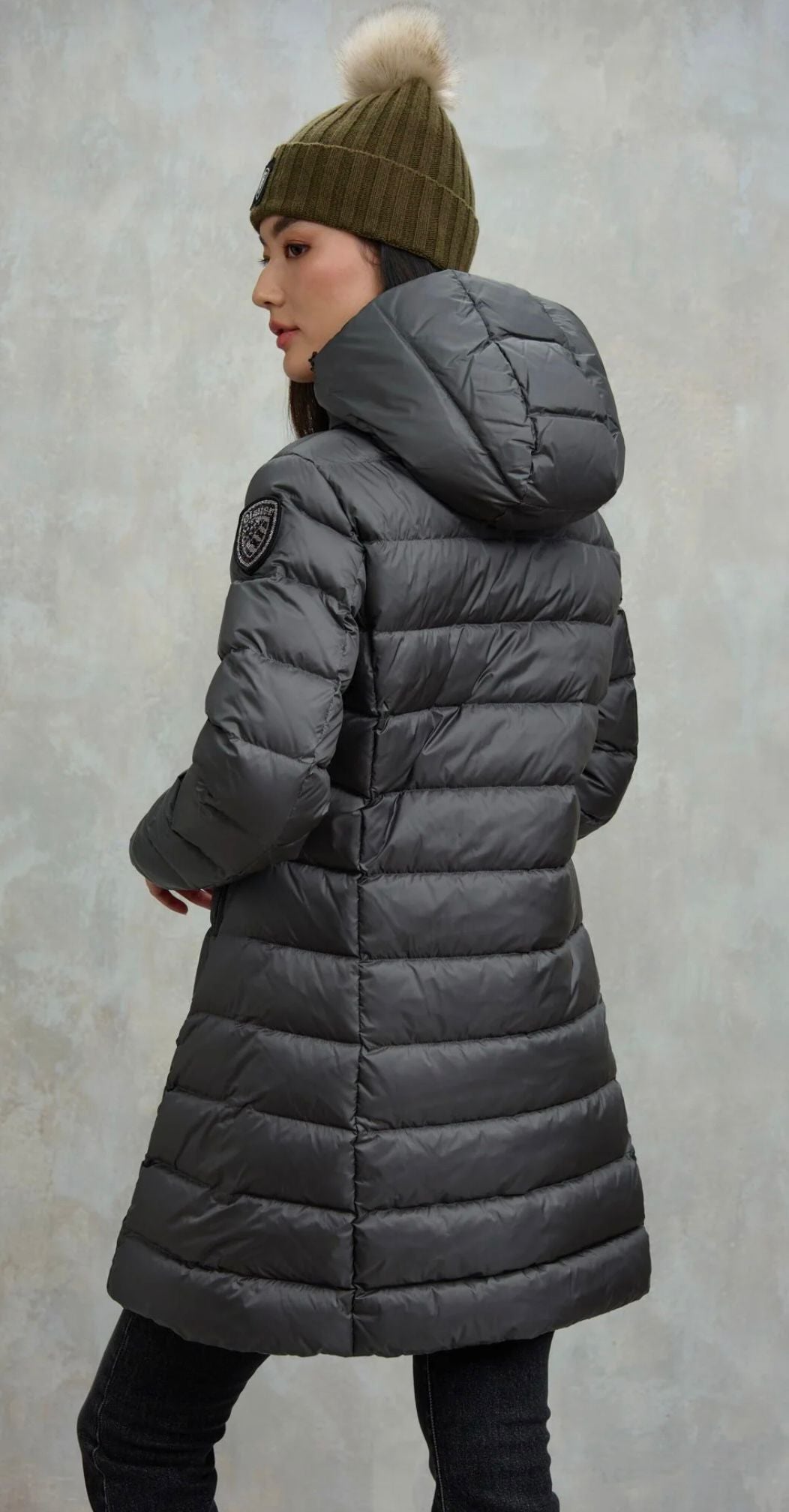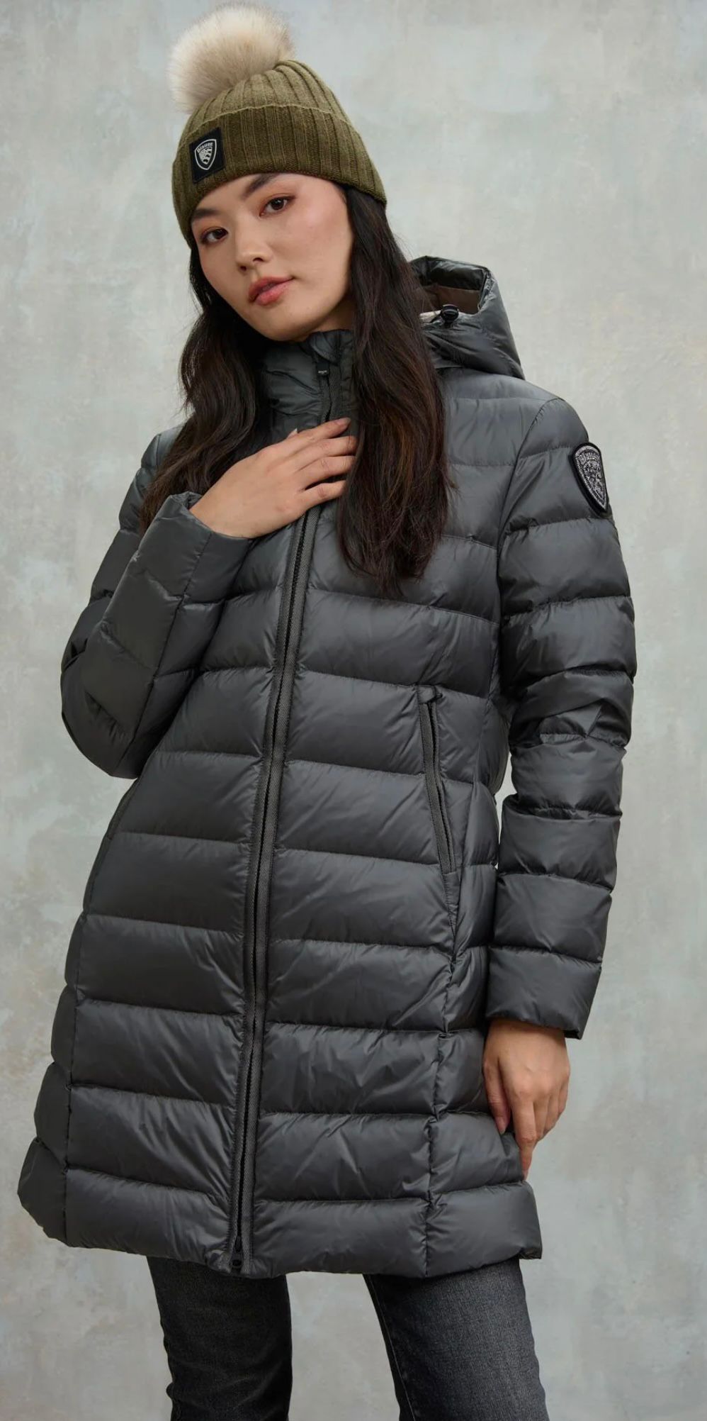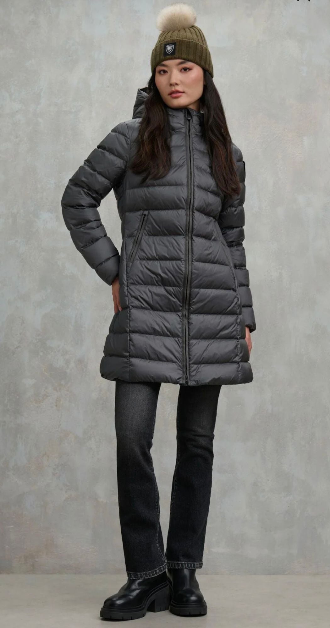 Piumino lungo trapuntato a righe orizzontali ed interno in contrasto colore. Capo con imbottitura naturale morbida, calda e non ingombrante, dai colori fashion e dal taglio che risalta il punto vita.
