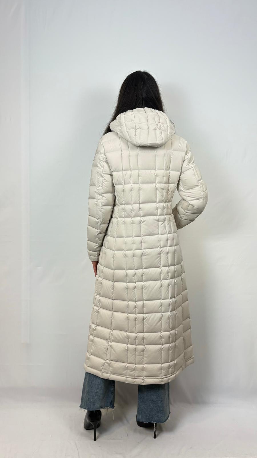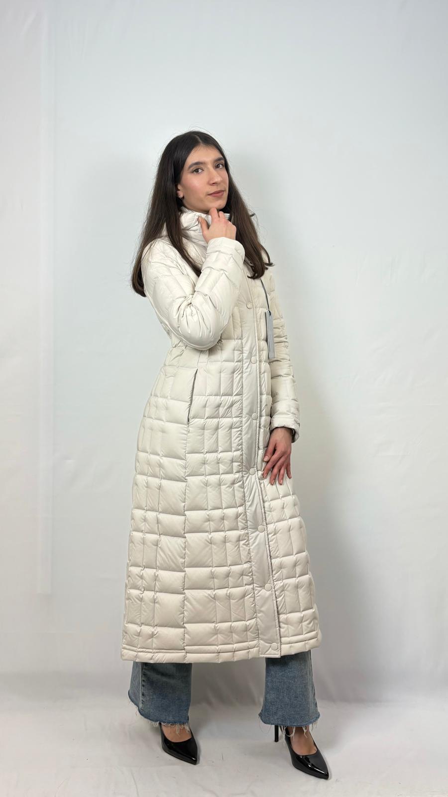Piumino lungo con impuntura termosaldata a quadretti. Collo interno, cappuccio fisso e look elegante, leggermente più stretto in vita, caratterizzano questo capo.