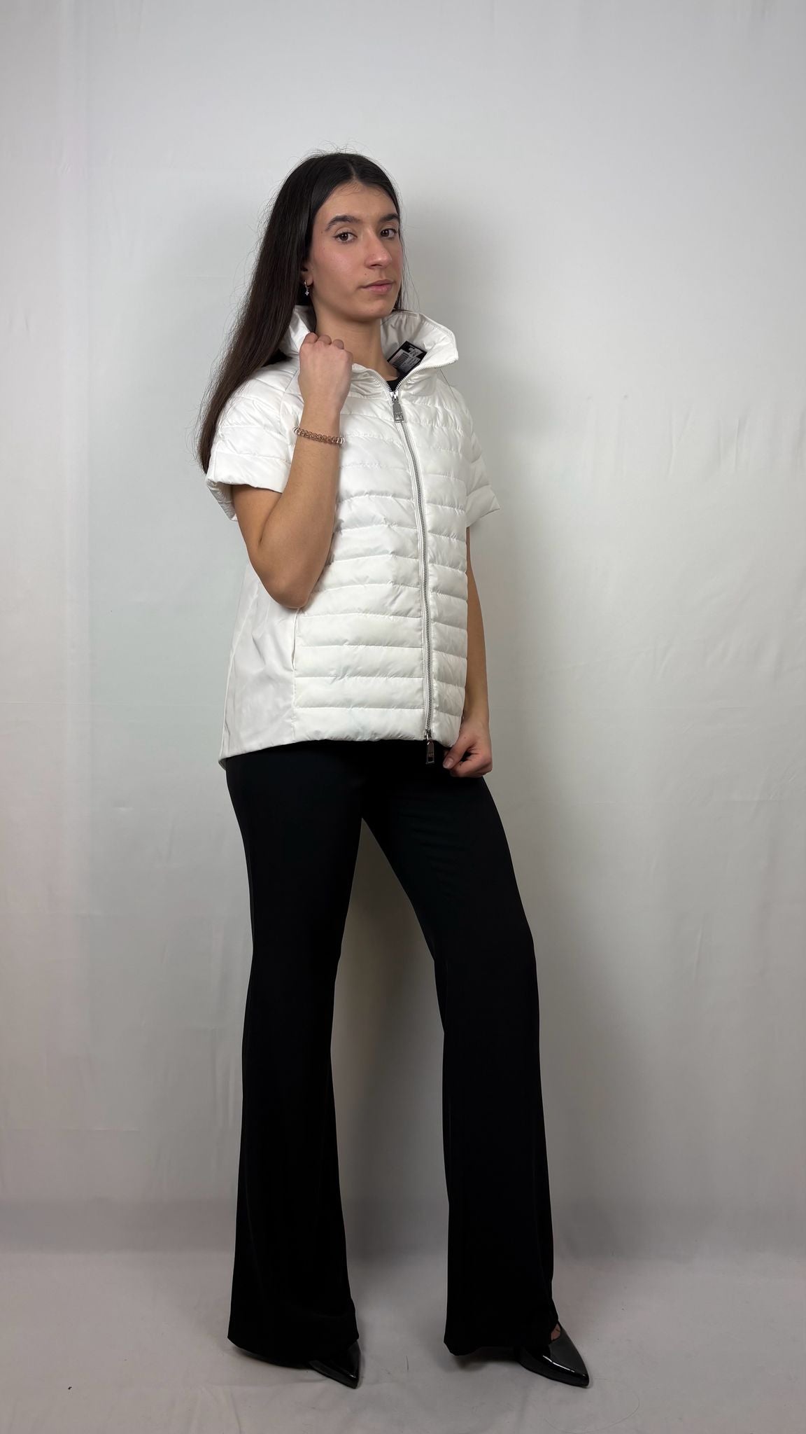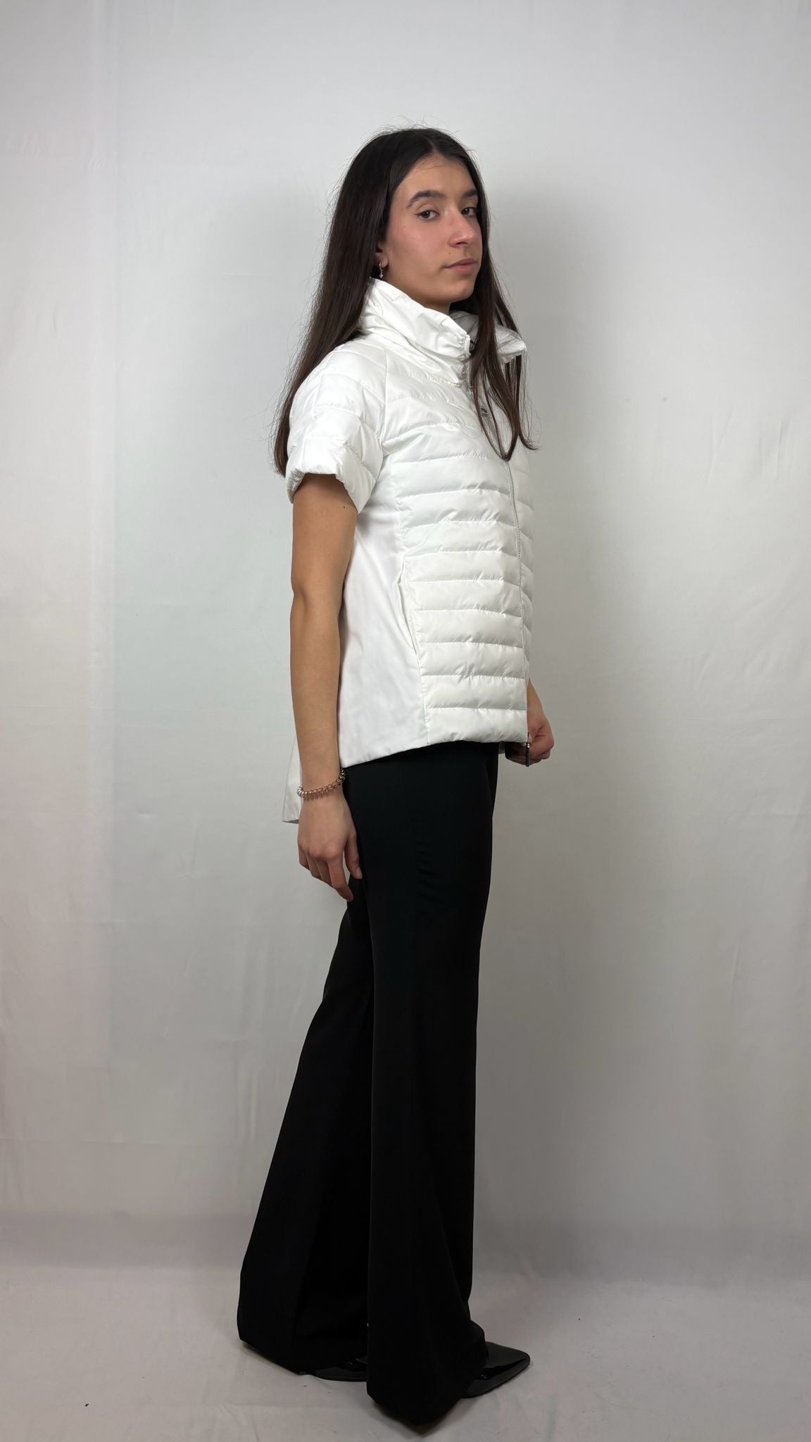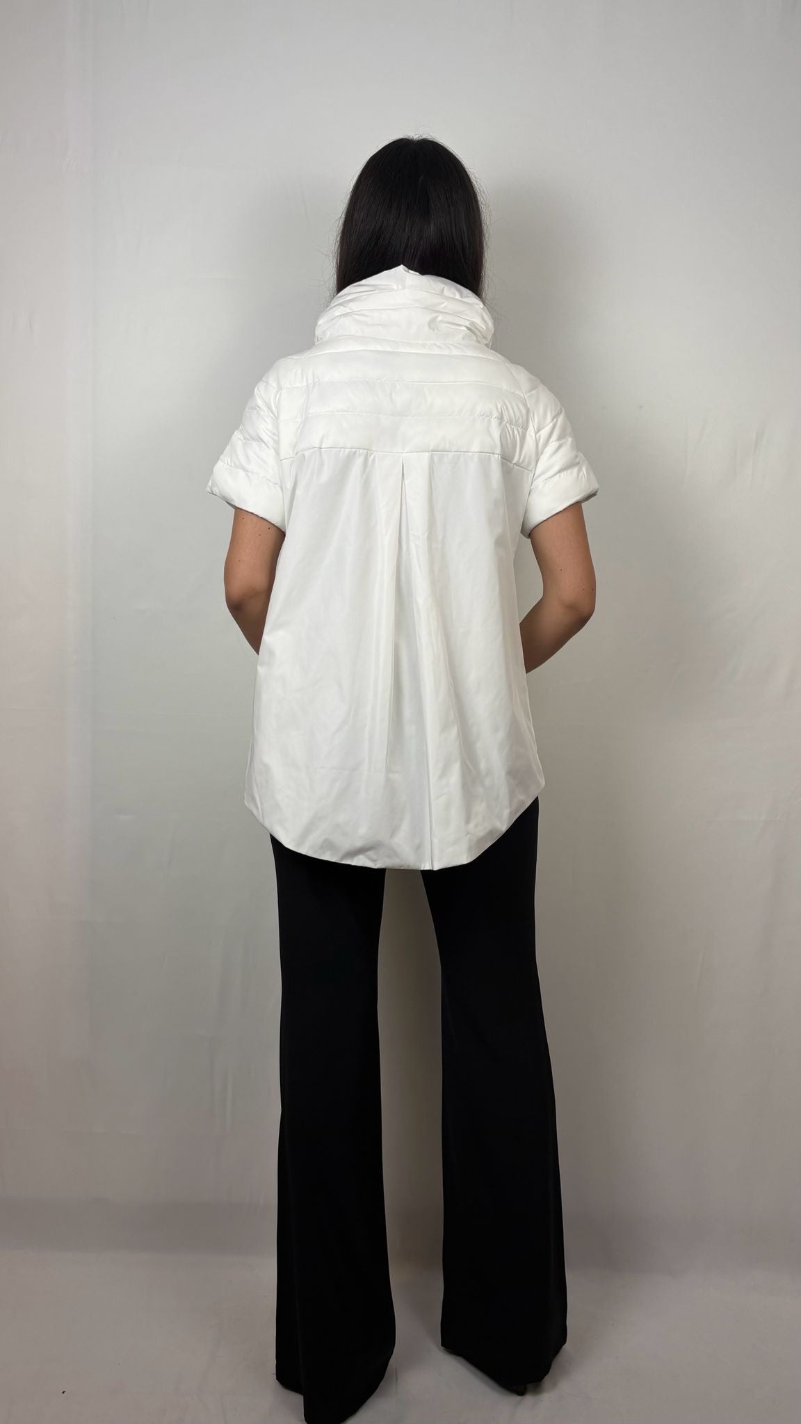 Il taglio si allarga leggermente verso il fondo, garantendo una vestibilità ariosa e moderna. Il design a manica corta permette di giocare con i contrasti, lasciando intravedere maglie a contrasto o camicie sottostanti. La parte anteriore è caratterizzata da una trapuntatura orizzontale classica a canali stretti, che fornisce isolamento termico mirato sul petto. A differenza del fronte, i fianchi e l'intera parte inferiore del retro sono realizzati in un tessuto tecnico liscio e non trapuntato. La particolarità tecnica risiede nella schiena, dove il tessuto liscio crea un effetto "mantella" o a trapezio, grazie a una pince centrale che apre il volume verso il basso. Un imponente collo alto imbottito che incornicia il viso, offrendo protezione e un tocco di eleganza scultorea.
