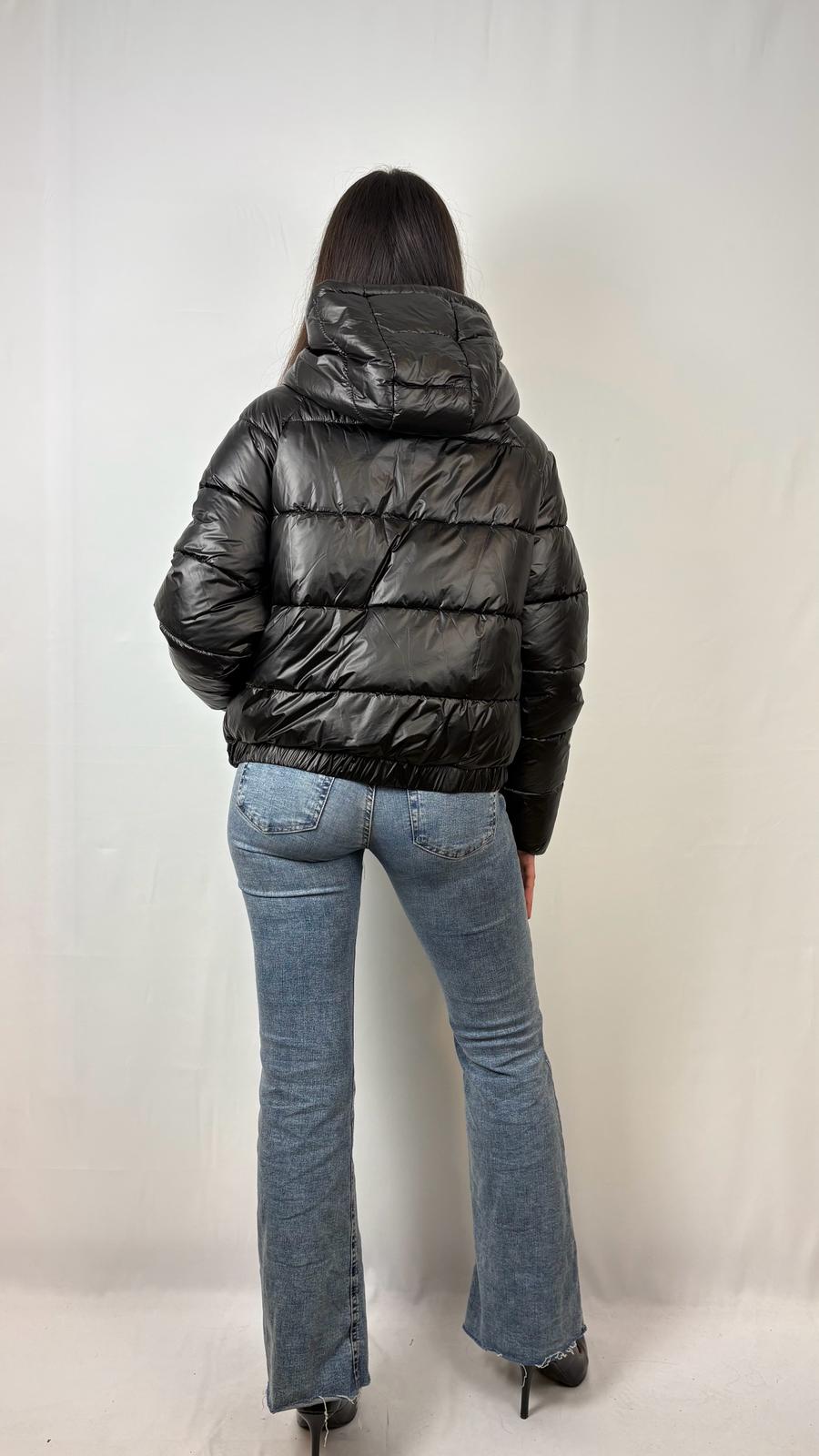 Piumino corto nero lucido modello blouson.