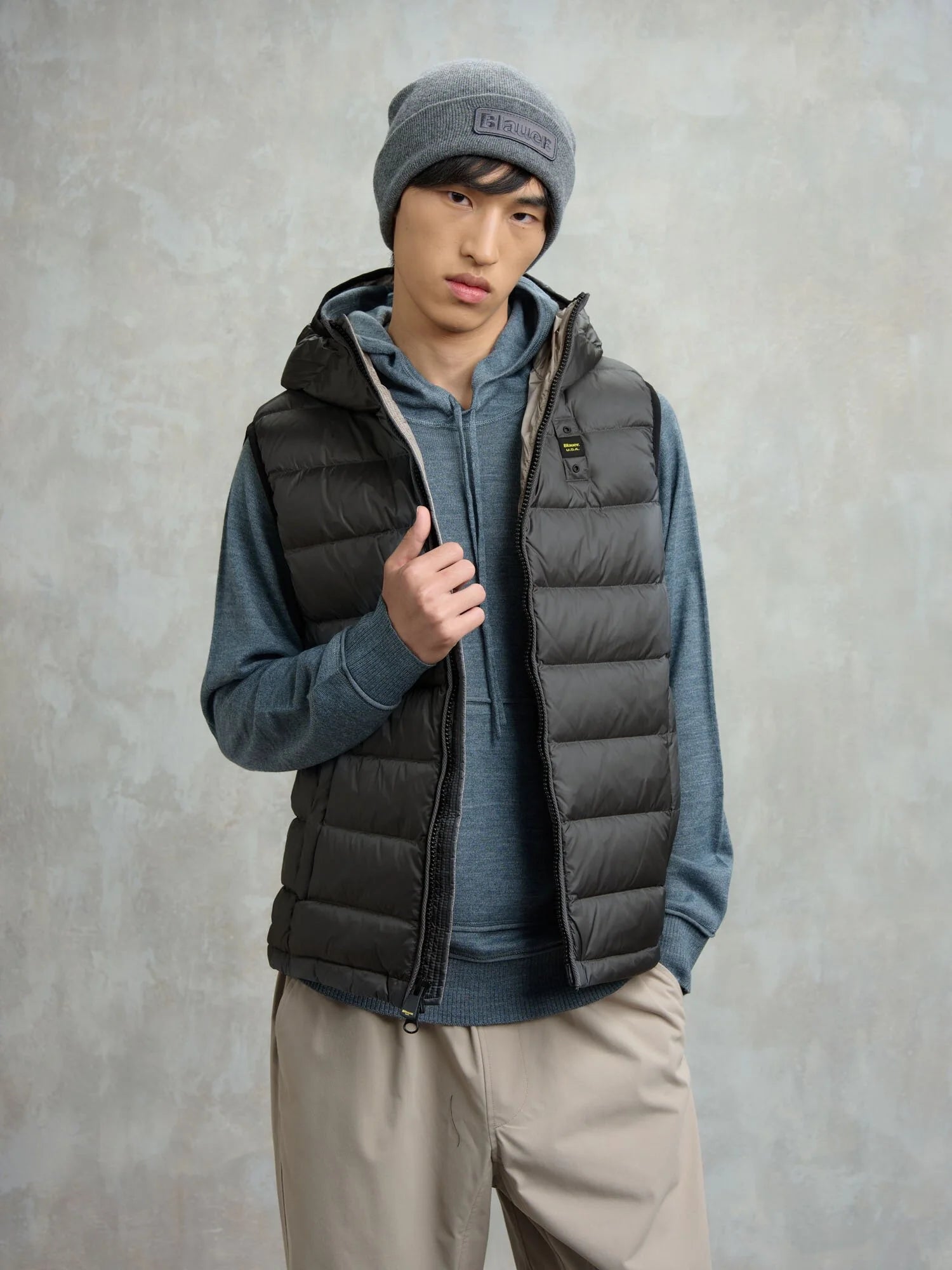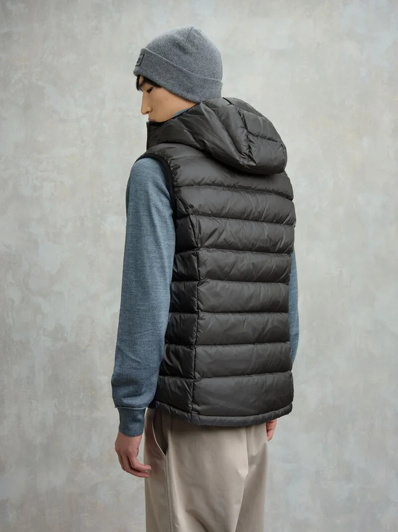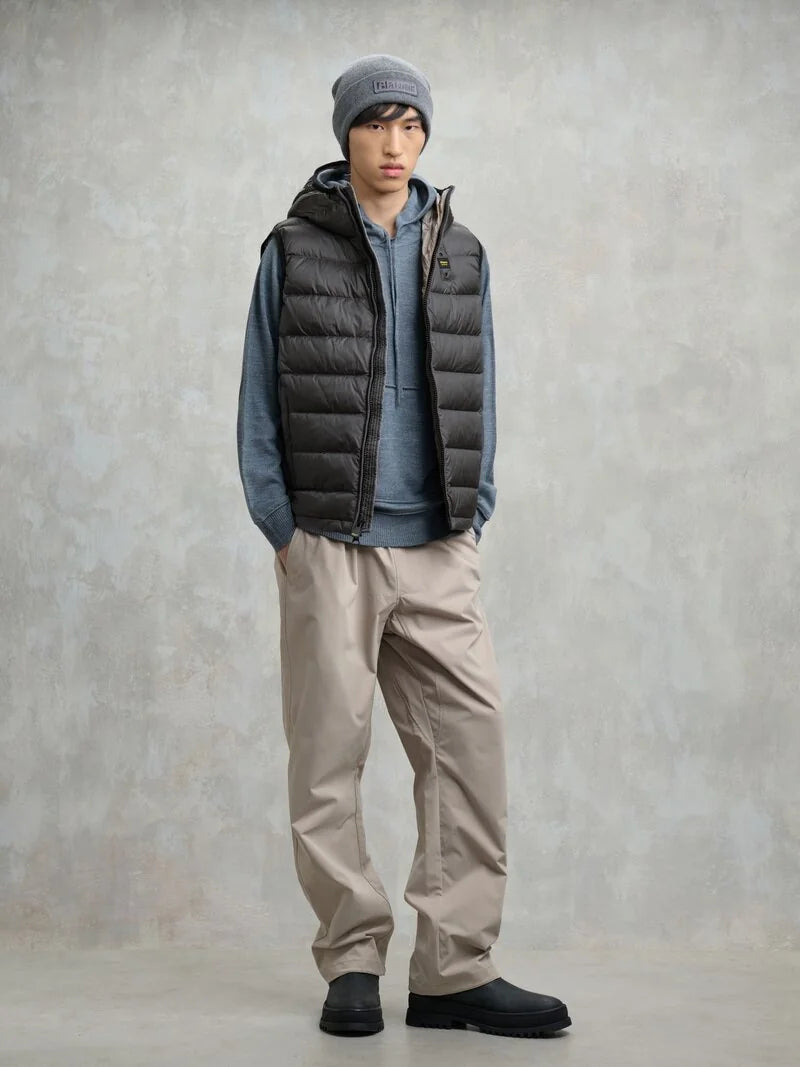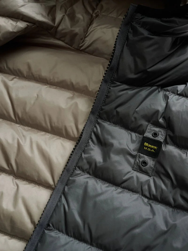 Piumino uomo senza maniche con cappuccio trapuntato a righe orizzontali. Capo iconico Blauer con imbottitura naturale in piuma, calda e non ingombrante; dedicato a chi vuole essere comodo e alla moda in ogni occasione.