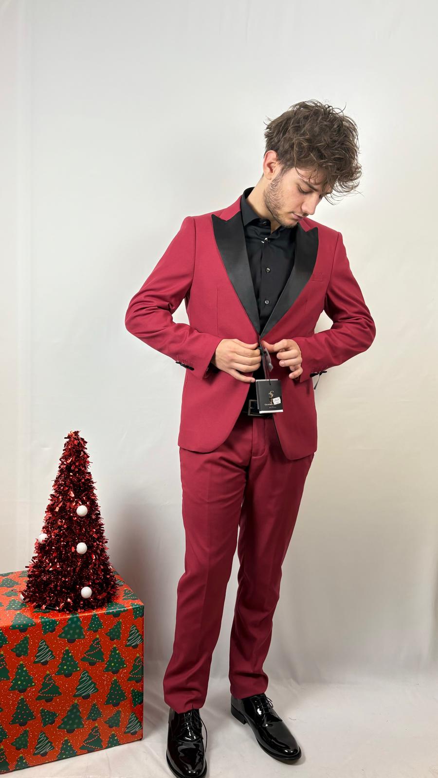 Giacca monopetto di colore rosso con un taglio moderno e sciancrato. Il dettaglio distintivo è il rever a lancia in raso nero a contrasto, tipico dello smoking. Presenta inoltre tasche a filetto profilate in nero.