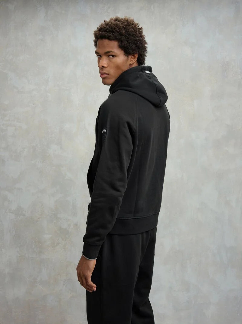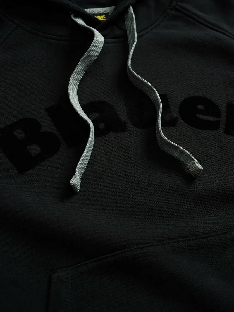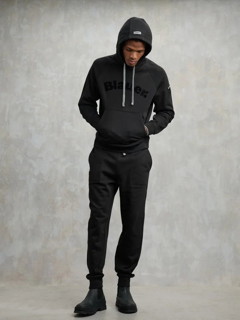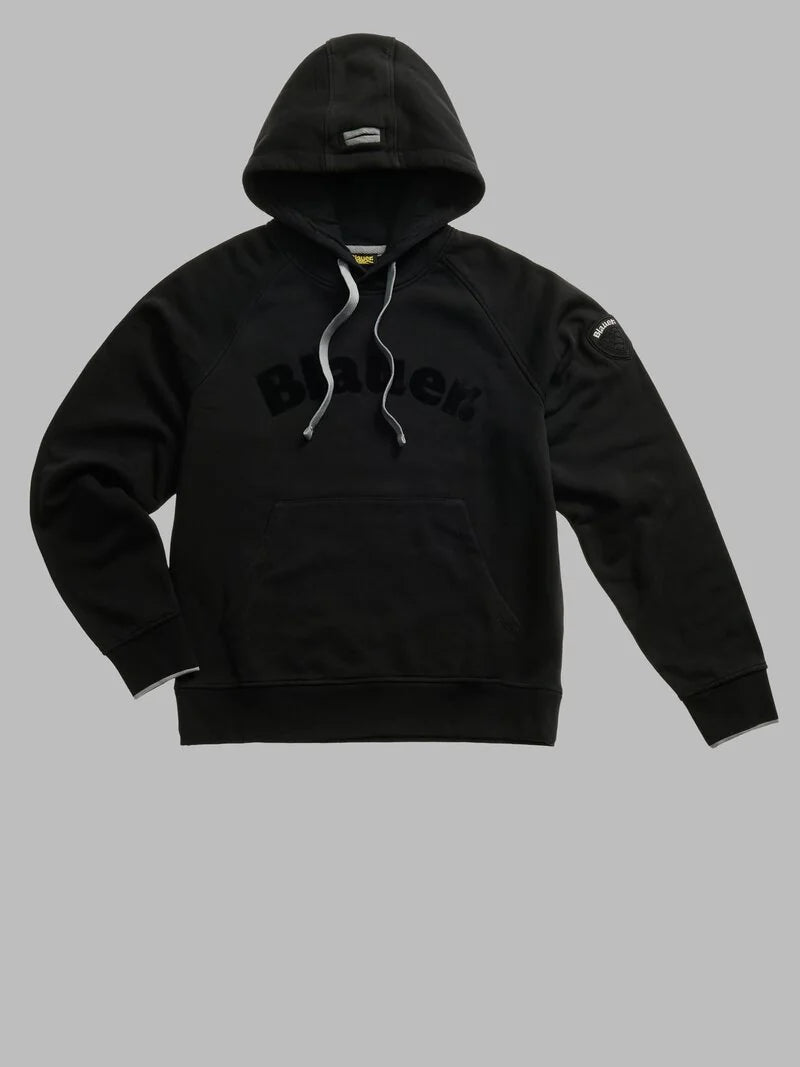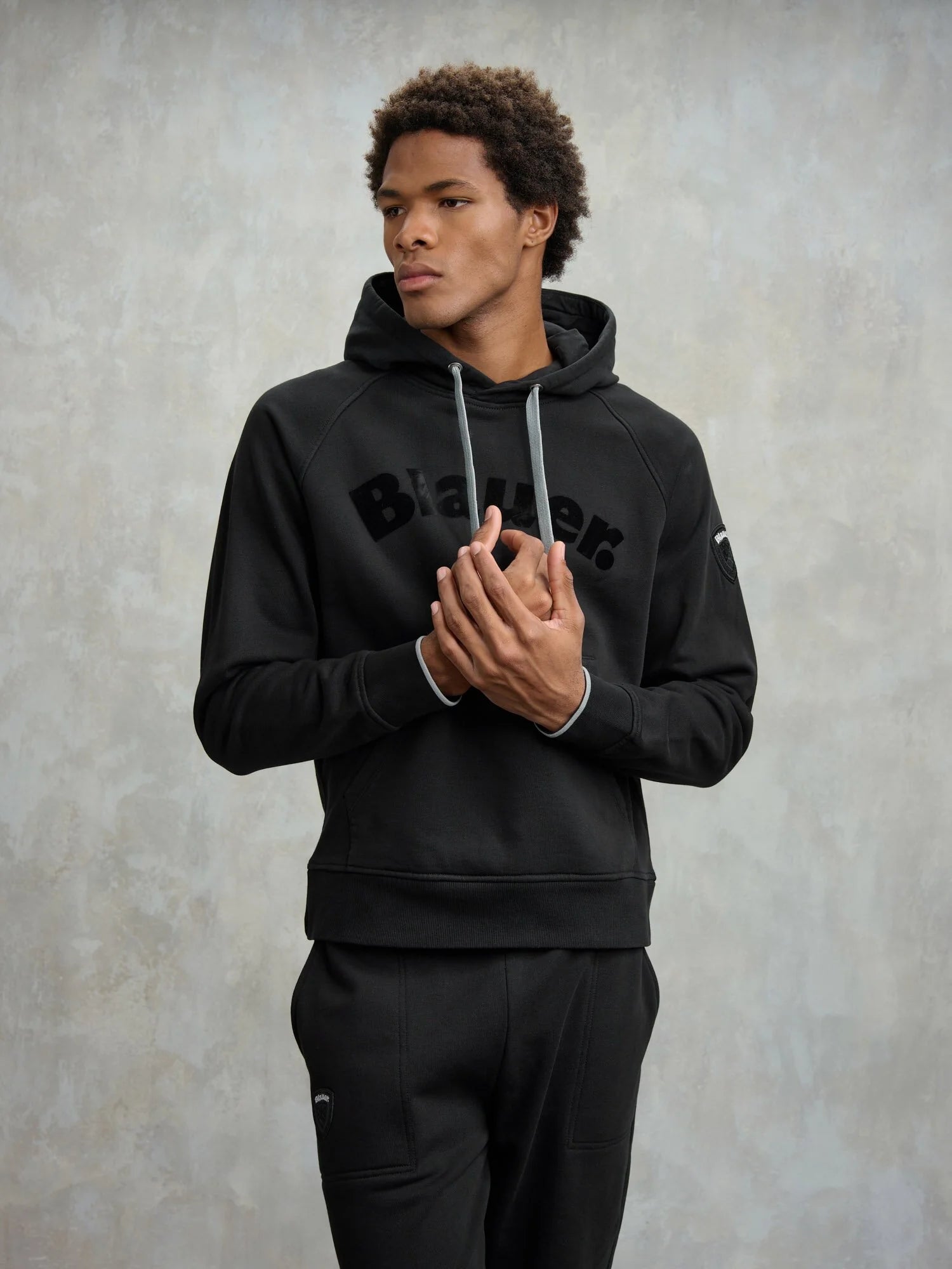 Felpa chiusa davanti con cappuccio fisso e coulisse in contrasto colore. Decoro con fettuccia in contrasto colore nel cappuccio.