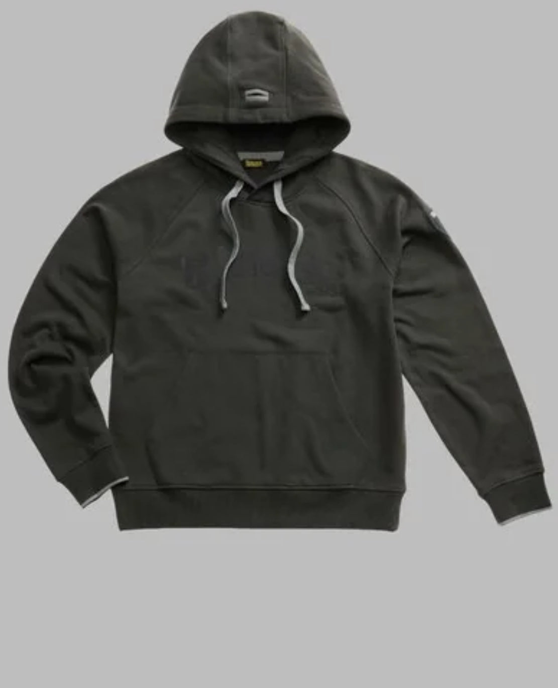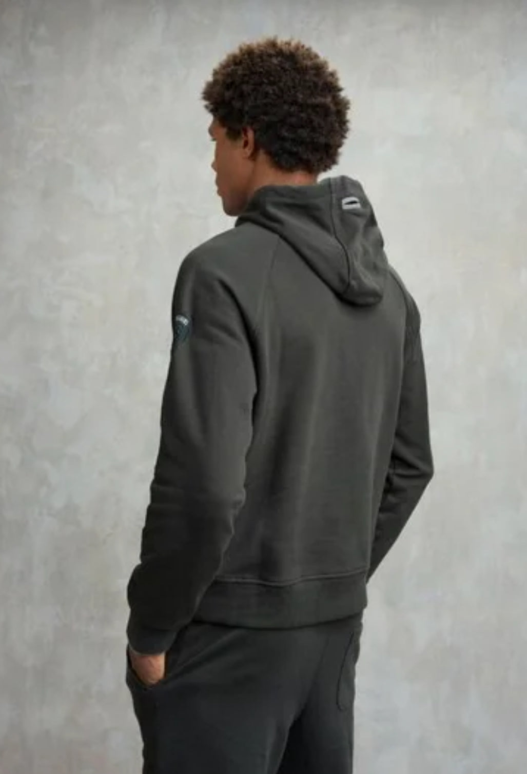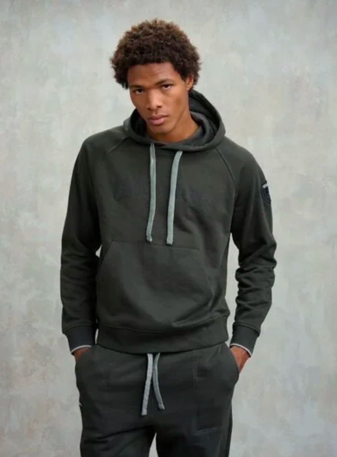 Felpa chiusa davanti con cappuccio fisso e coulisse in contrasto colore. Decoro con fettuccia in contrasto colore nel cappuccio.