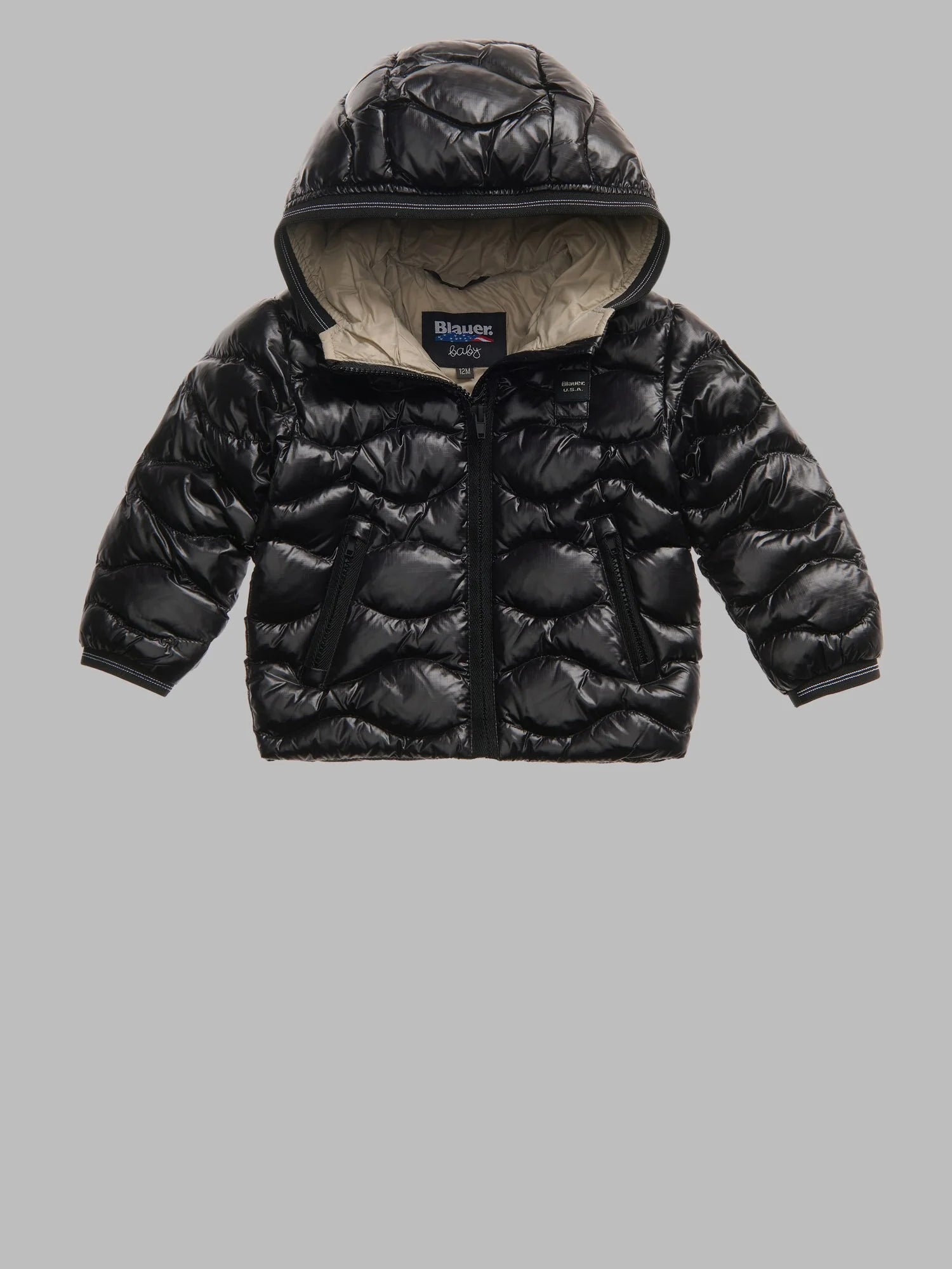 Giubbetto con cappuccio trapuntato ad onde orizzontali. Capo iconico Blauer dedicato a chi vuole un bambino vestito alla moda.