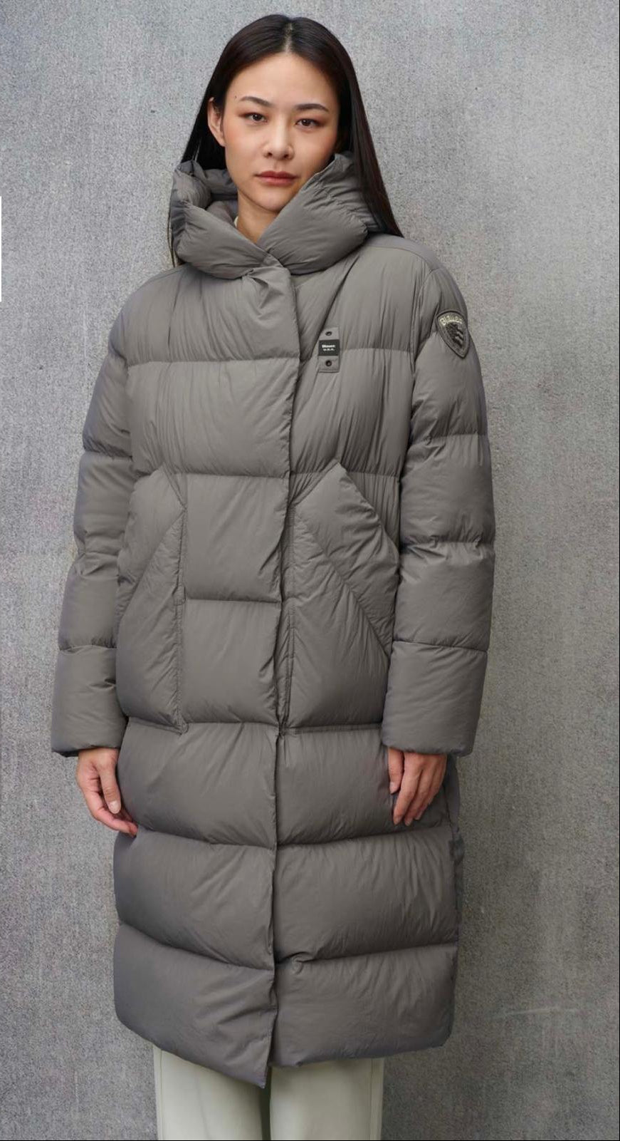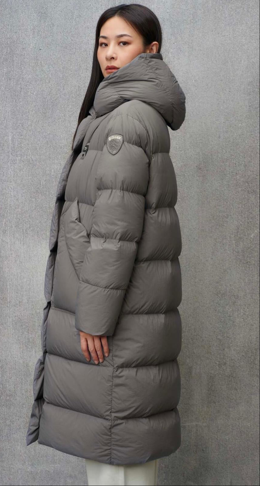 Piumino lungo trapuntato con linee orinzontali. Imbottito di piume reale, morbido e caldo per un effetto simile a una nuvola. Un indumento soffice adatto a coloro che vogliono sentirsi avvolti in un abbraccio.