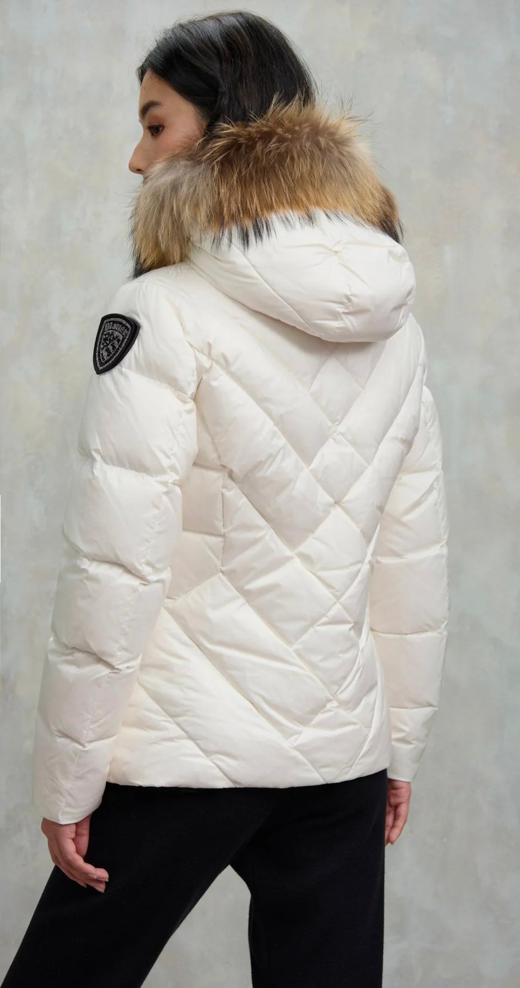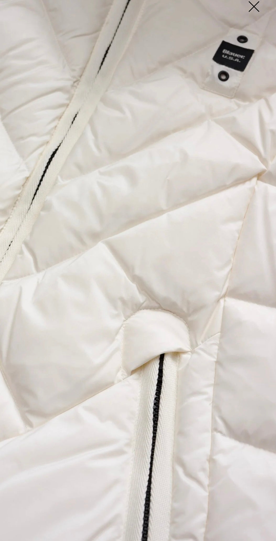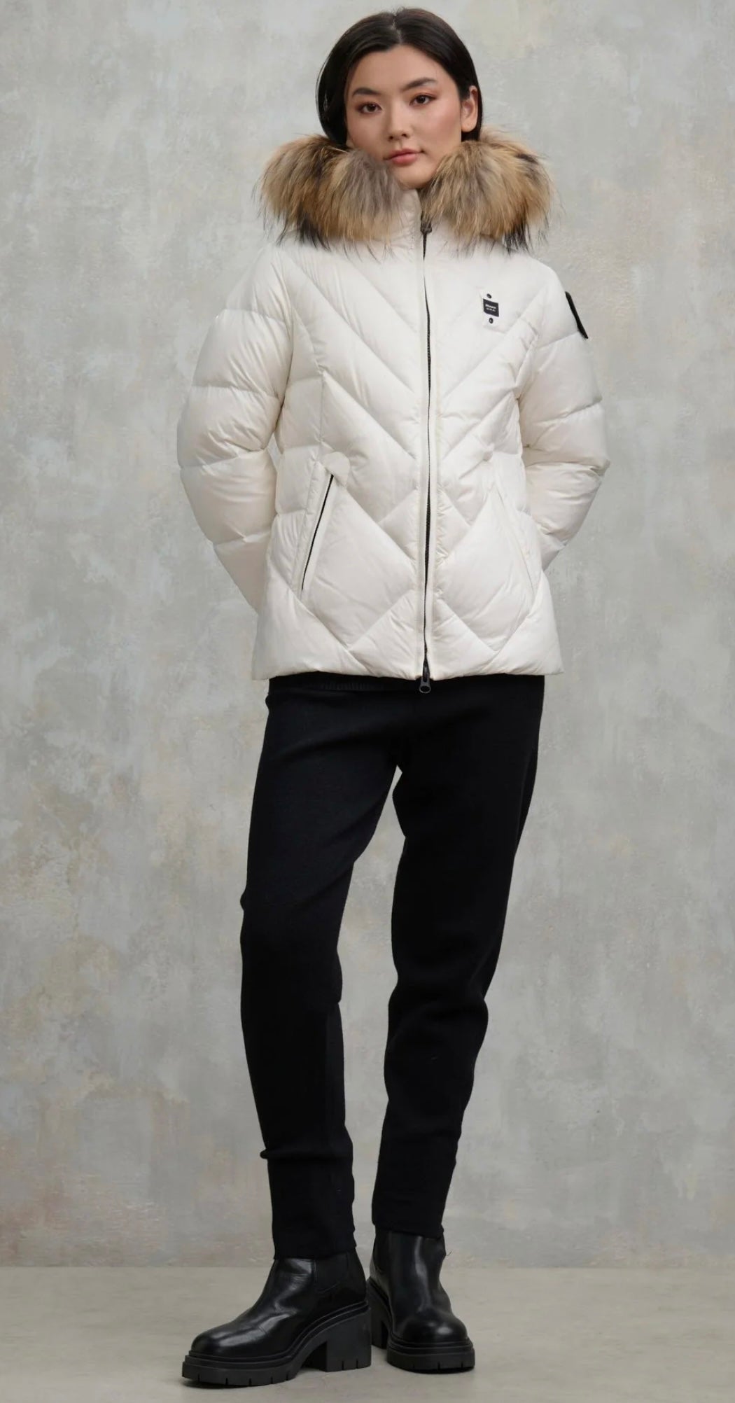 Piumino idrorepellente trapuntato a linee geometriche. Piumino sfiancato per donare risalto al punto vita.