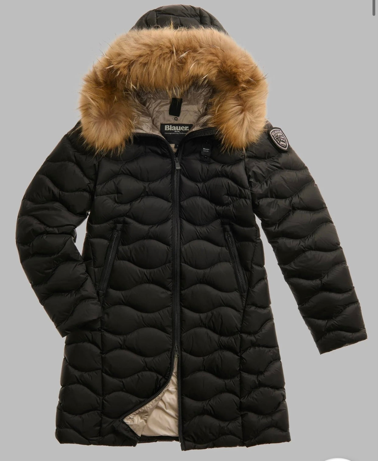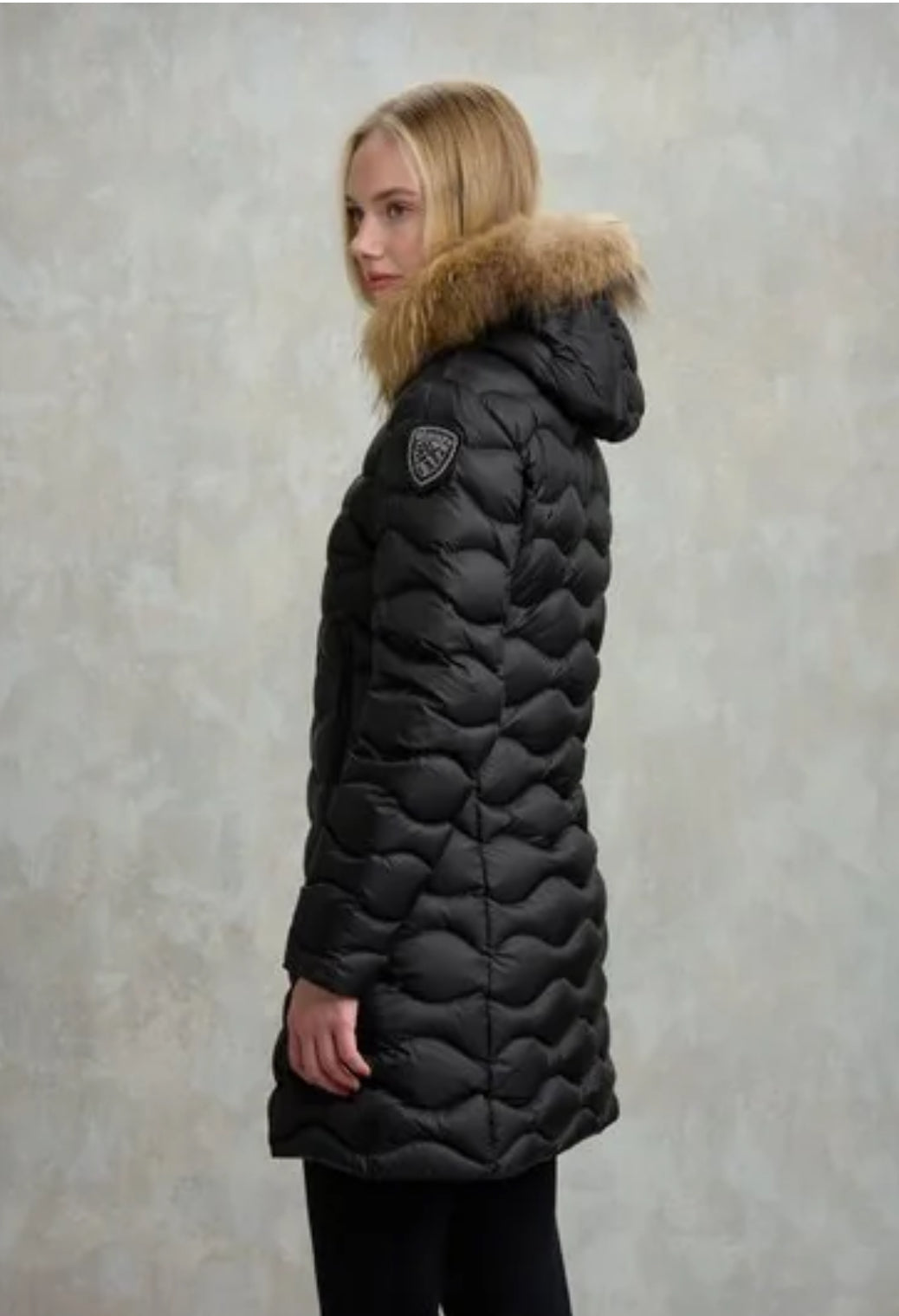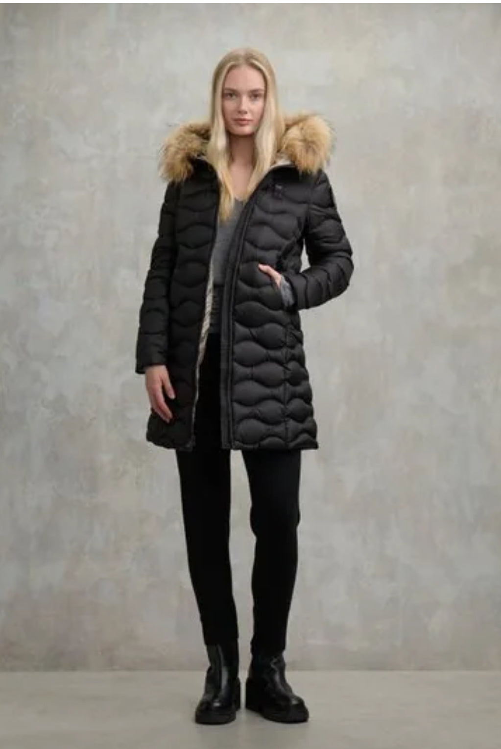 Piumino lungo trapuntato ad onde orizzontali con cappuccio fisso, profilo in vera pelliccia ed interno in contrasto colore. Capo donna con colori fashion e dal taglio che risalta il punto vita.