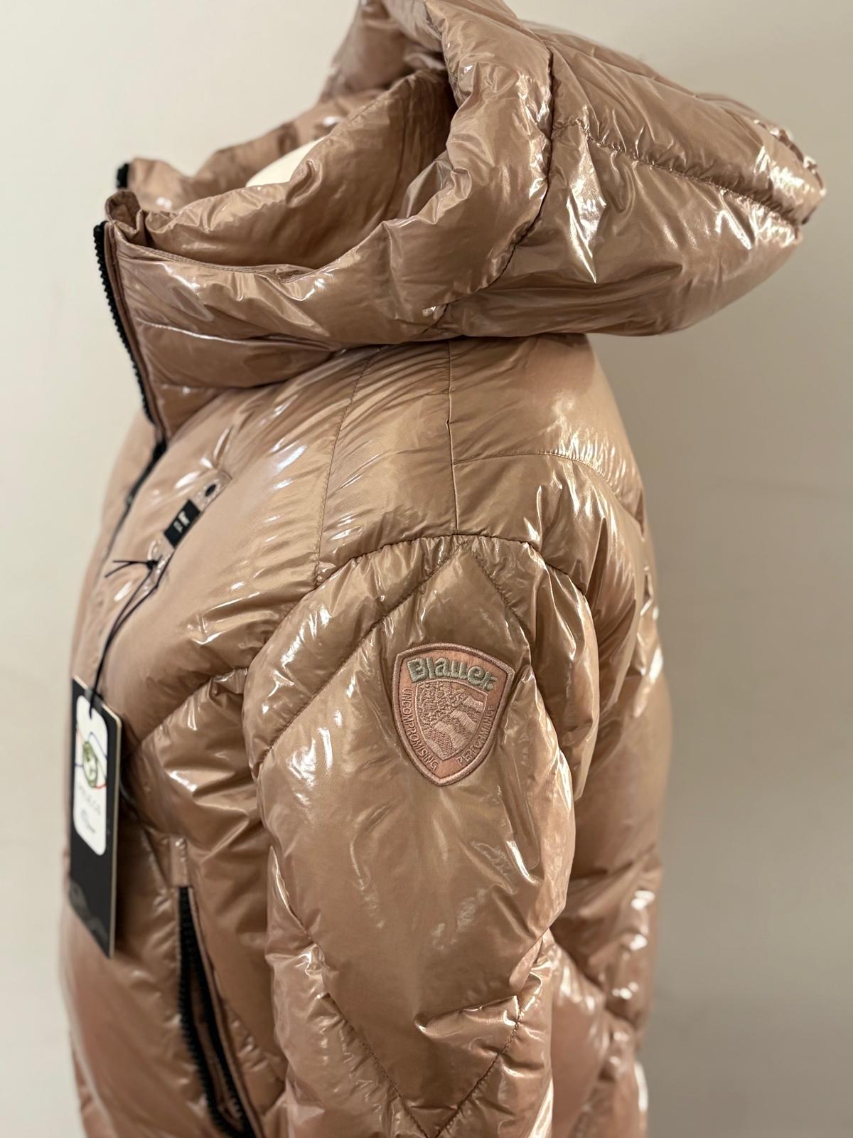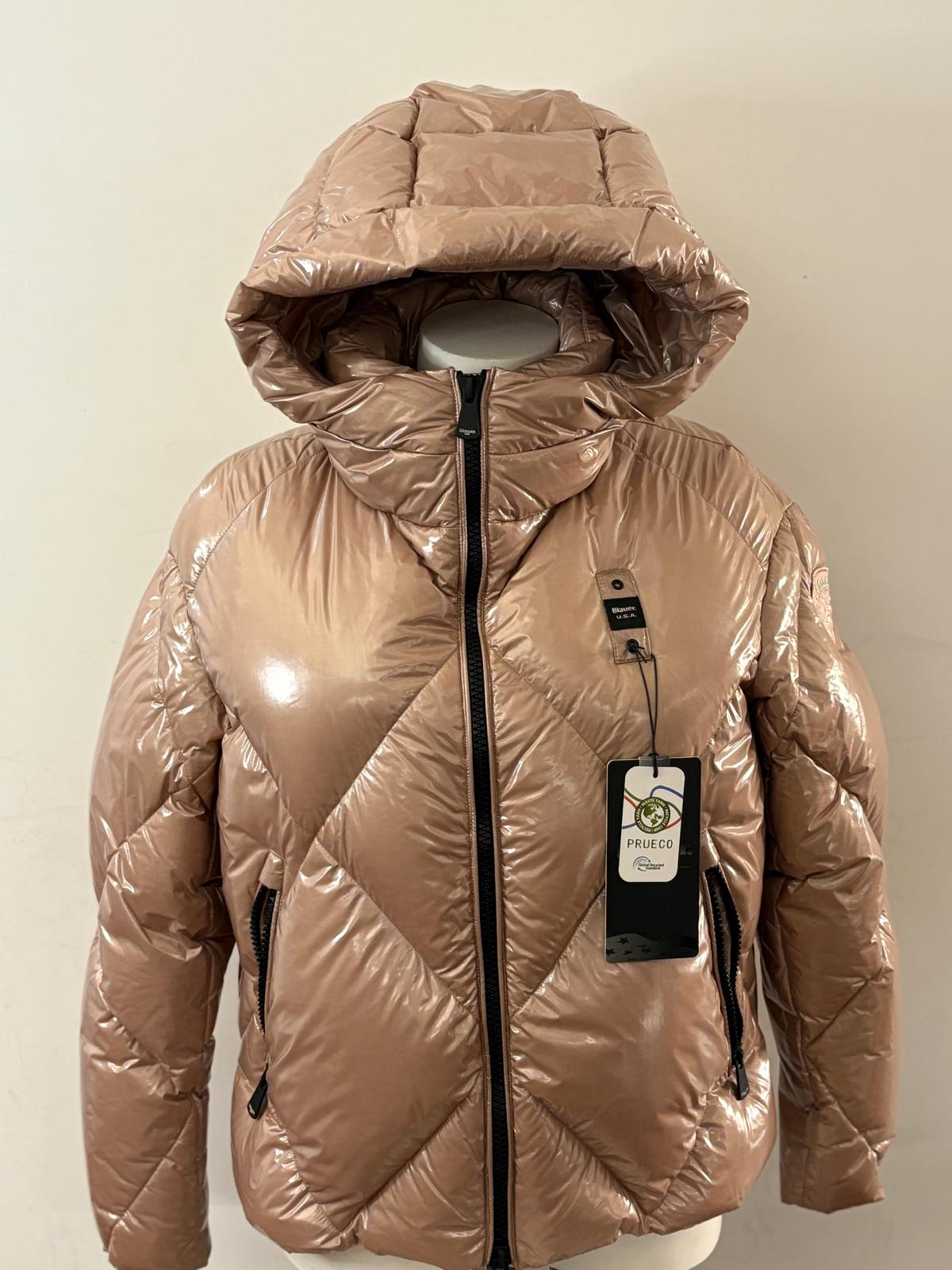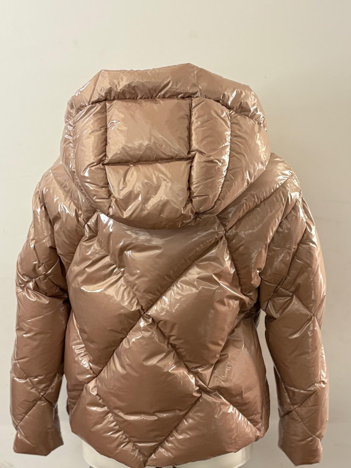 Piumino rosa cipria effetto lucido, capuccio fisso. Imbottito piuma perfetto per la pioggia