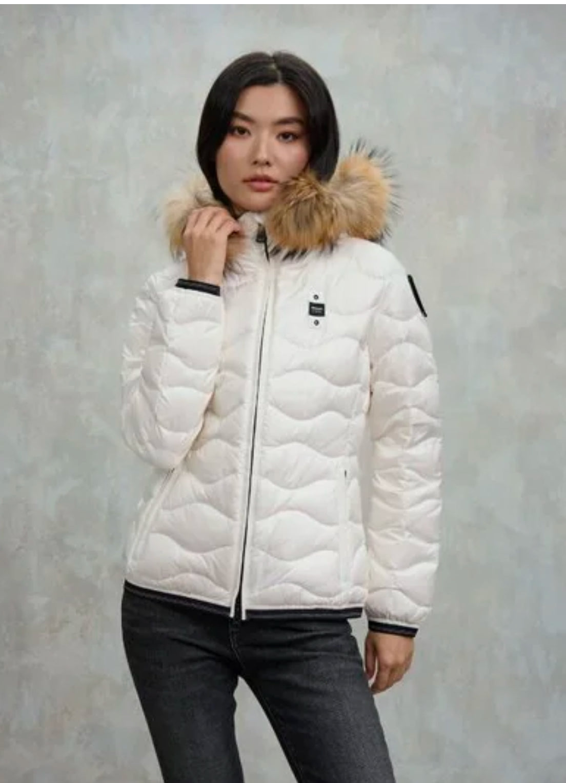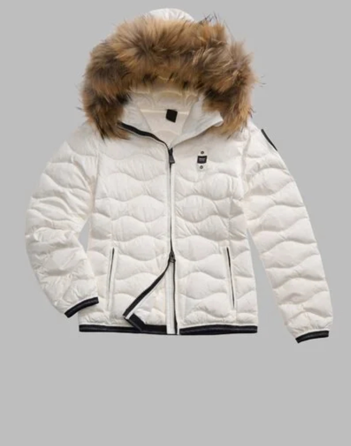 Piumino idrorepellente trapuntato ad onde orizzontali e con profilo del cappuccio in vera piuma. Capo iconico Blauer con imbottitura naturale, calda e non ingombrante, per essere sempre alla moda.