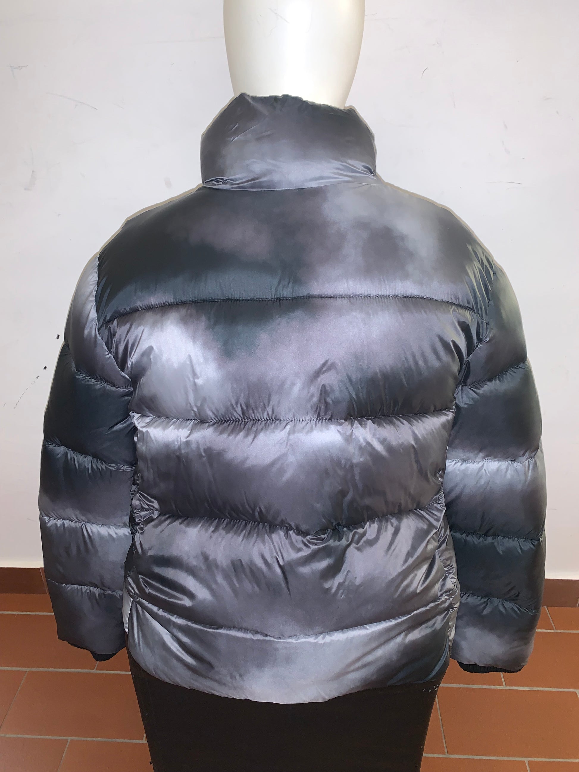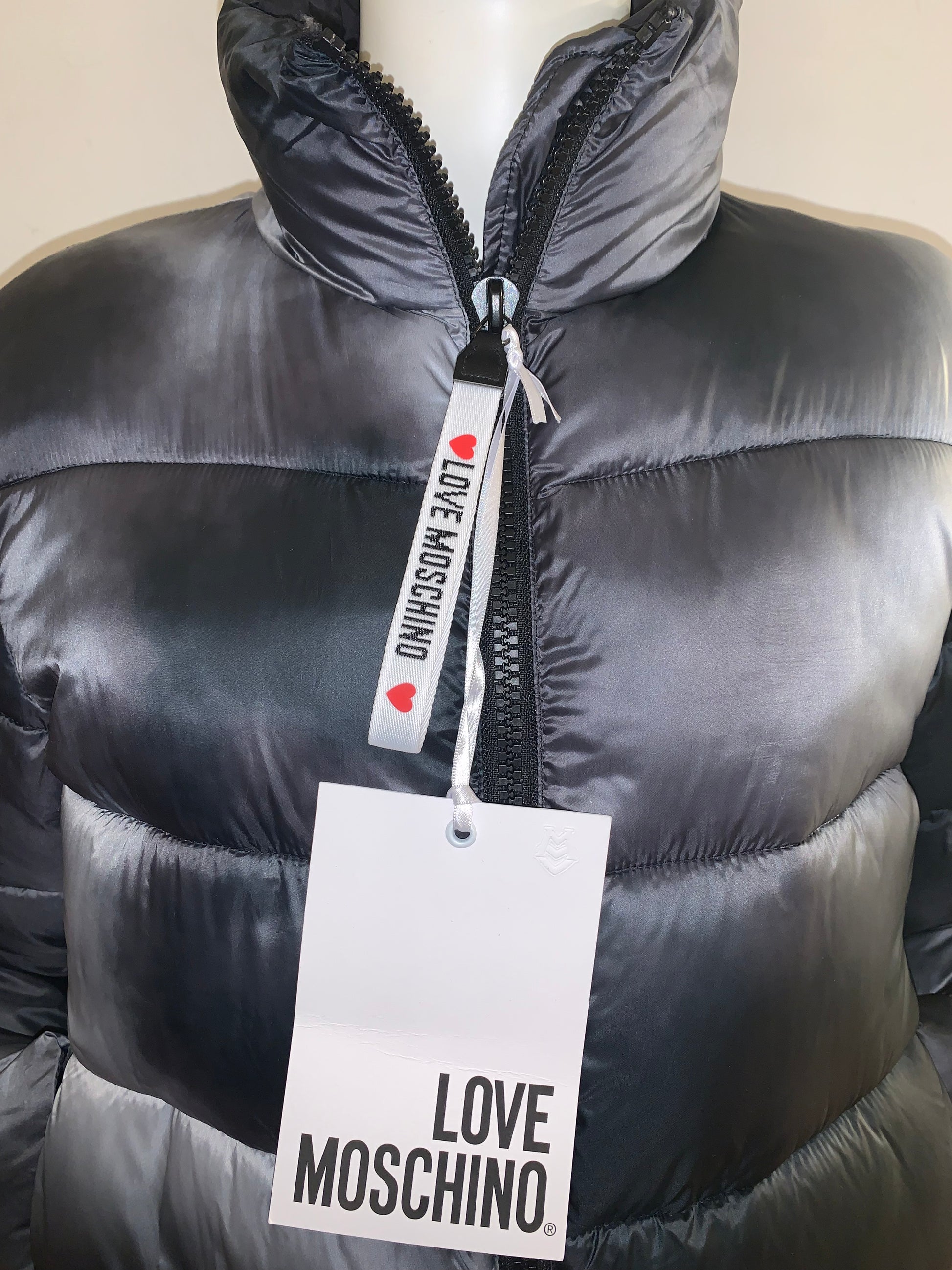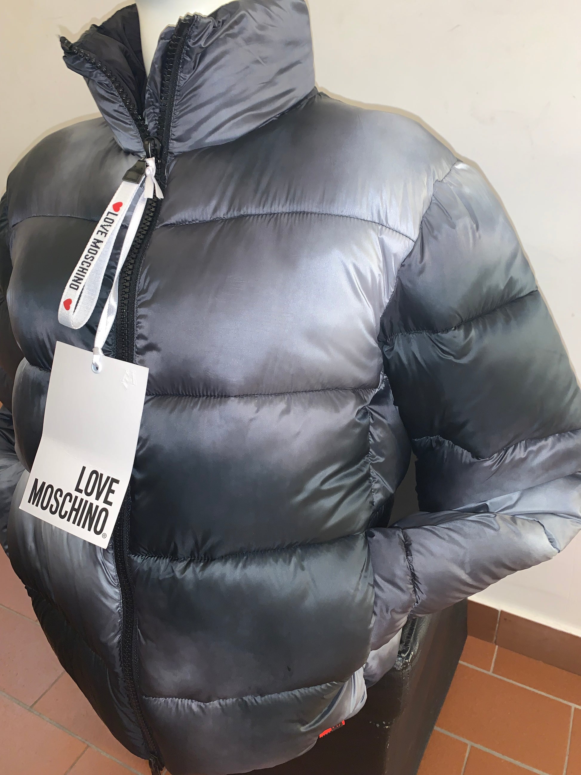 giubbetto grigio scuro con sfumature piu chiare Love moschino senza cappuccio. Fornito di polsini per mantenere il calore. imbottitura di ovatta