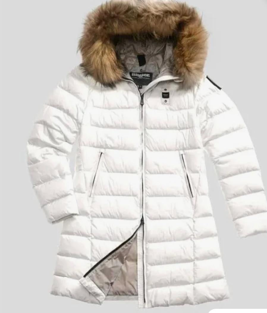 Piumino lucido lungo trapuntato a righe orizzontali con cappuccio fisso, bordo in pelliccia removibile ed interno in contrasto colore. Capo con colori fashion e dal taglio che risalta il punto vita.