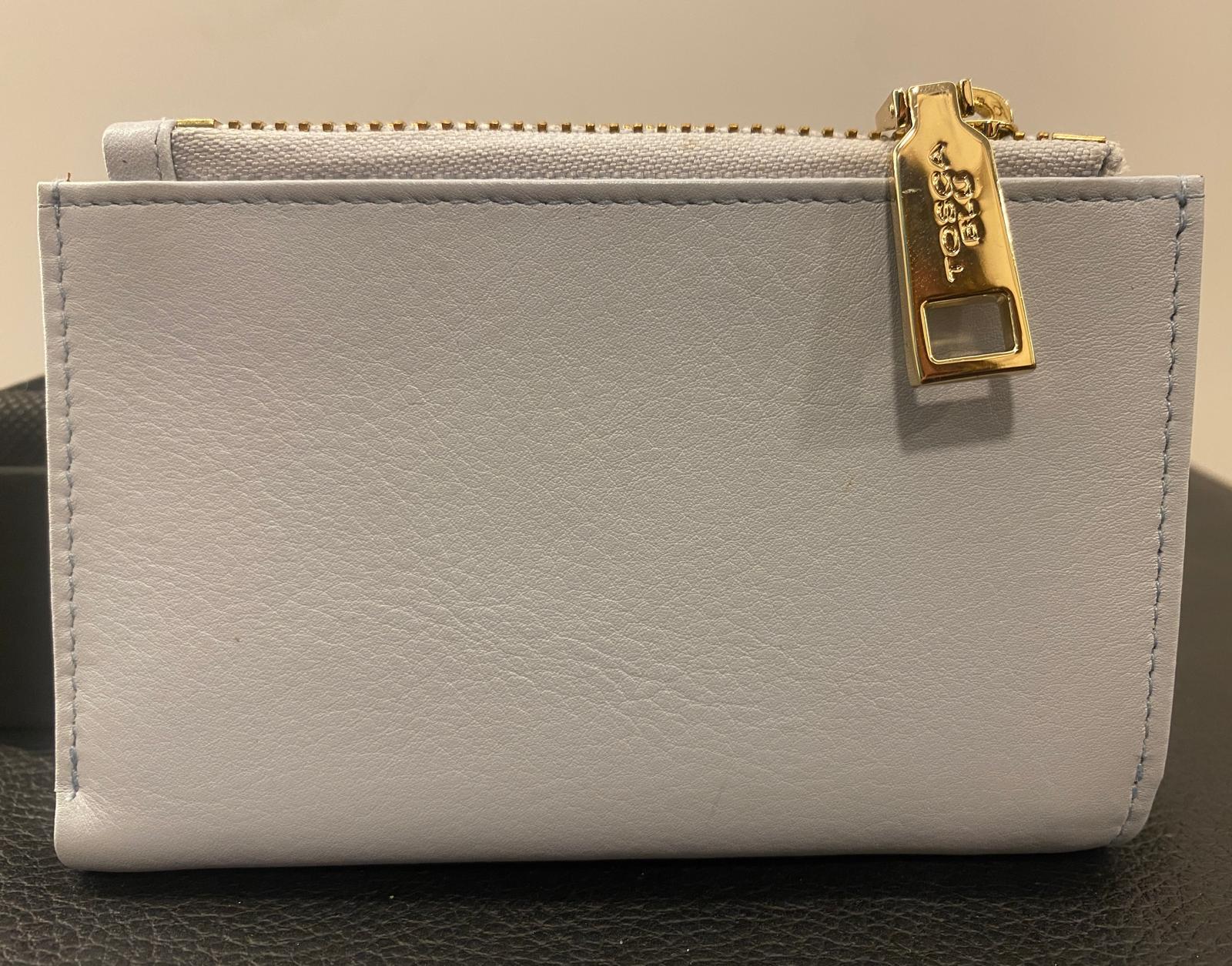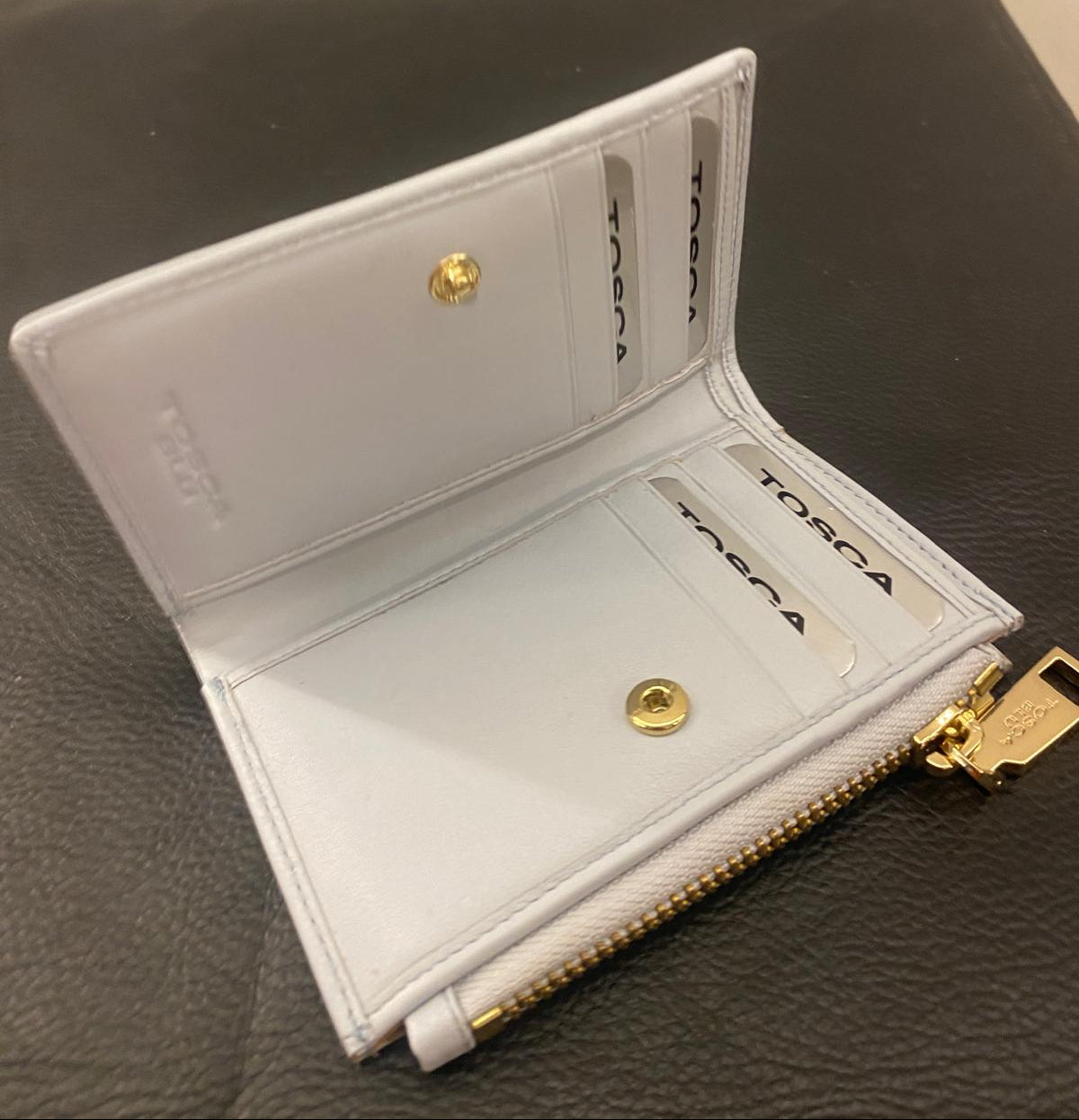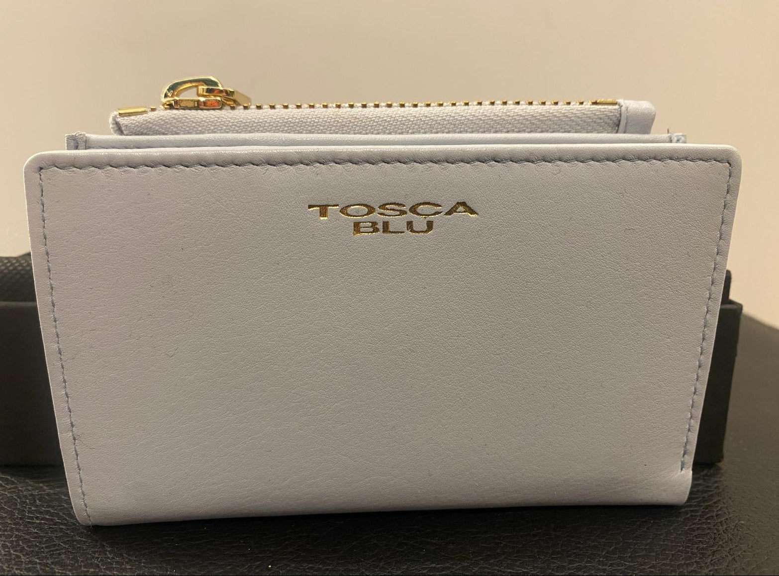 Portafoglio Tosca Blu in pelle a due ante composte da una chiusura a bottone che apre lo spazio per carte e banconote e una a zip per portare le monete.