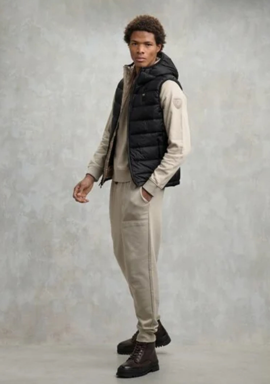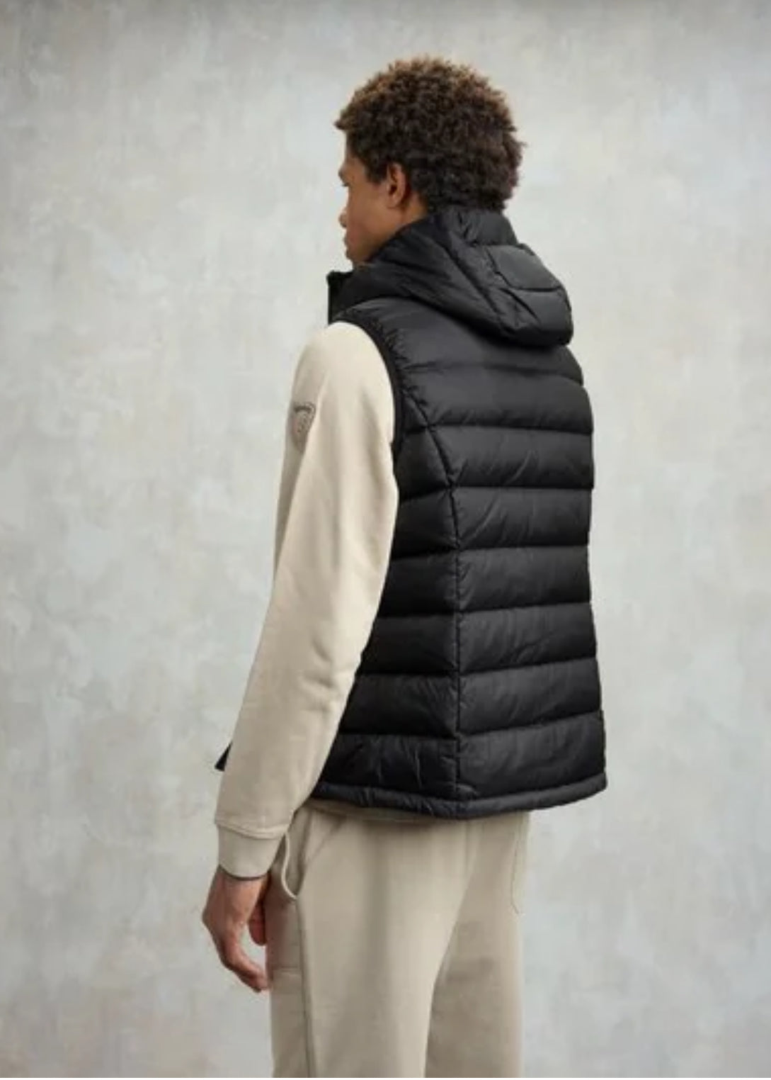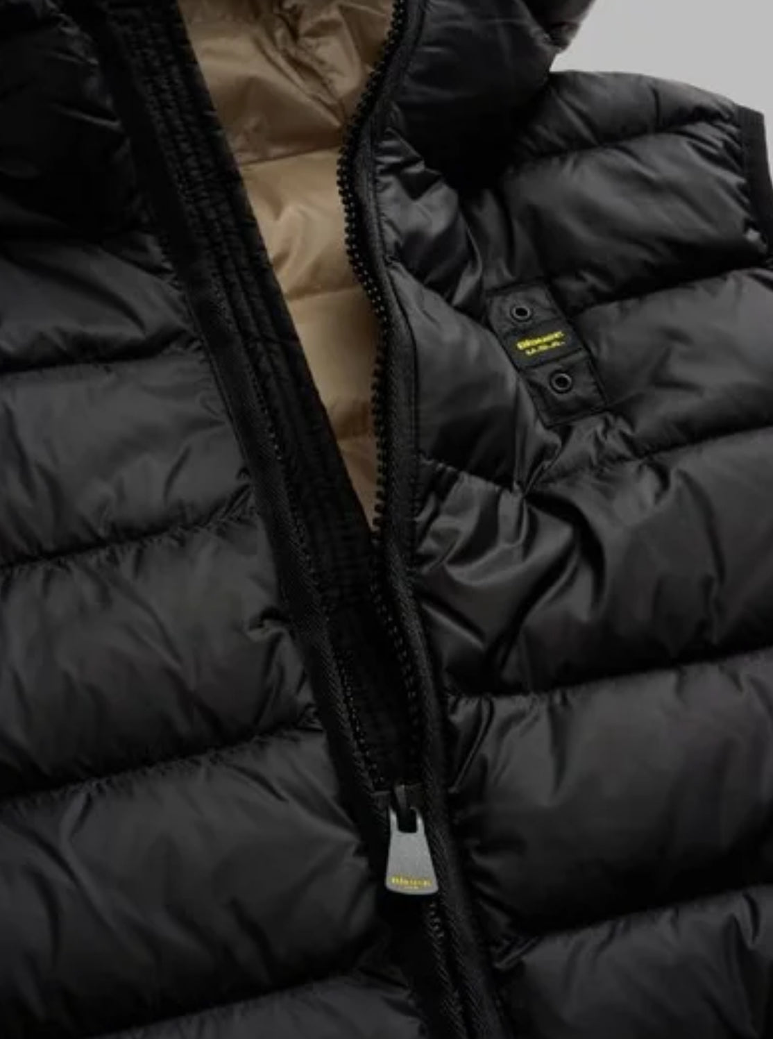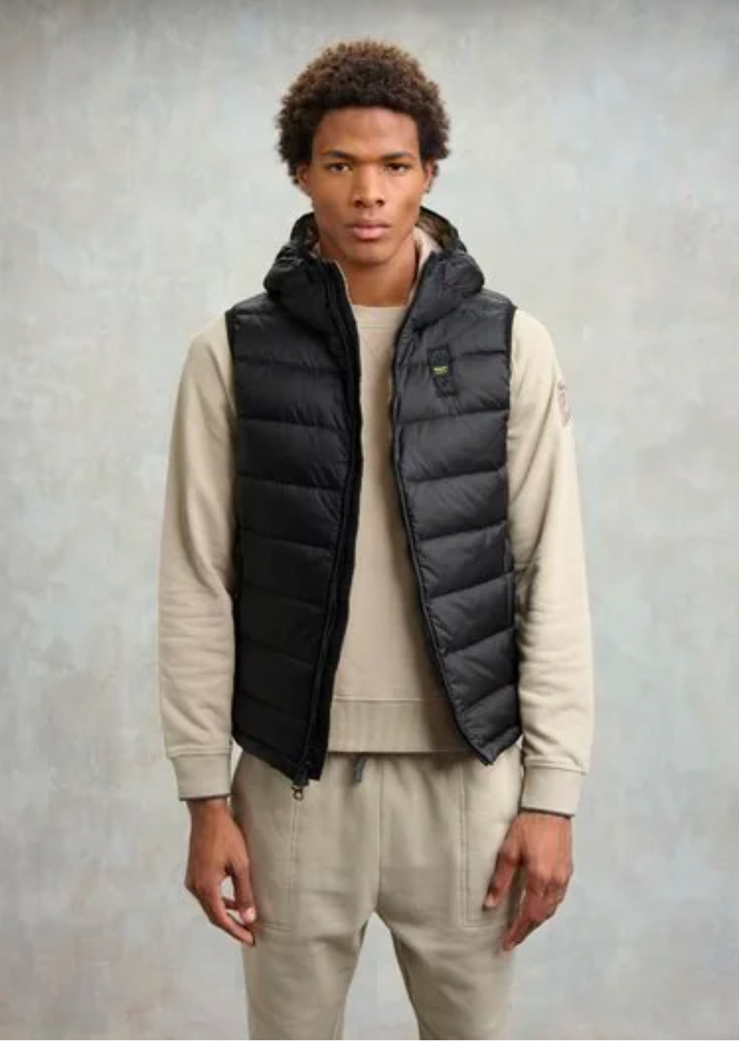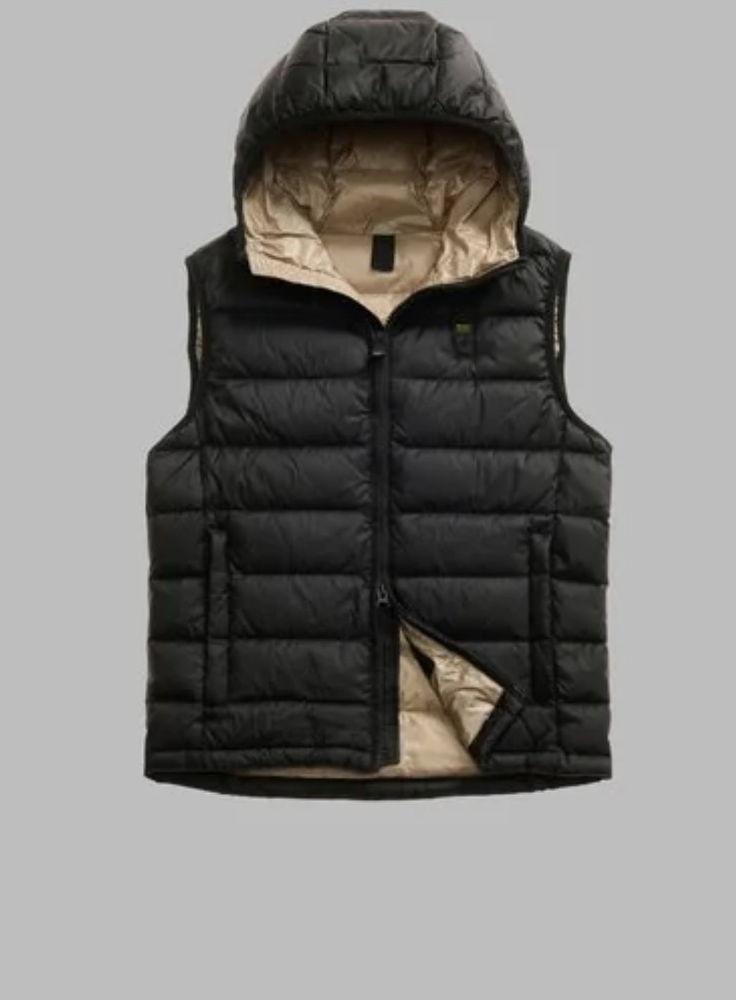 Piumino uomo senza maniche con cappuccio trapuntato a righe orizzontali. Capo iconico Blauer con imbottitura naturale in piuma, calda e non ingombrante; dedicato a chi vuole essere comodo e alla moda in ogni occasione.