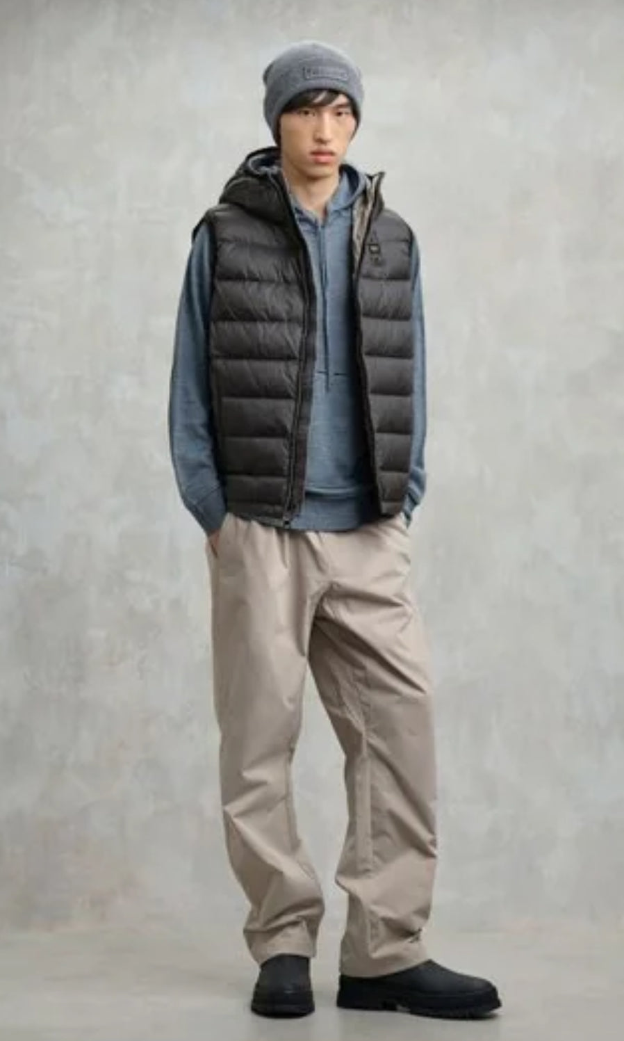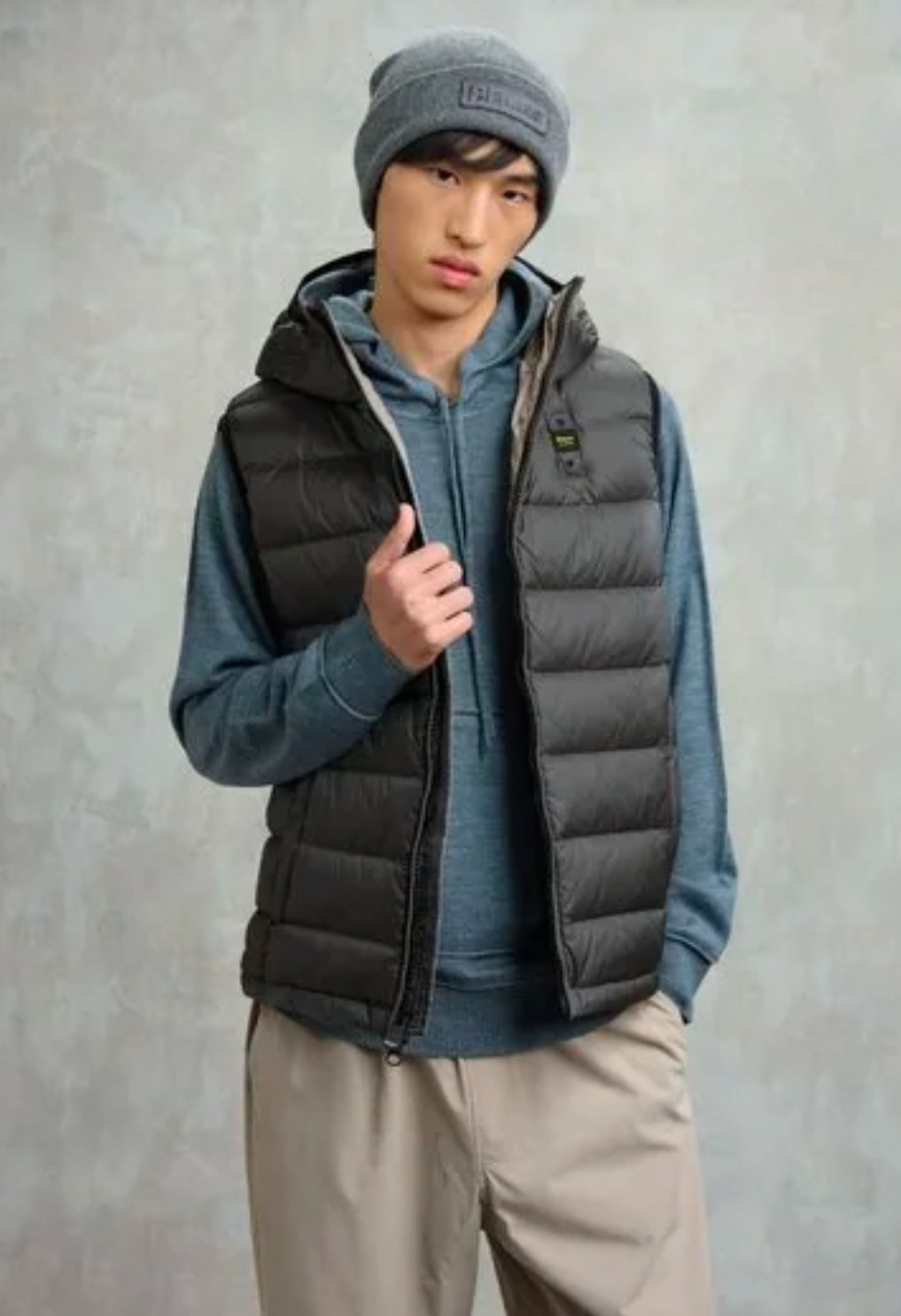 Piumino uomo senza maniche con cappuccio trapuntato a righe orizzontali. Capo iconico Blauer con imbottitura naturale in piuma, calda e non ingombrante; dedicato a chi vuole essere comodo e alla moda in ogni occasione.