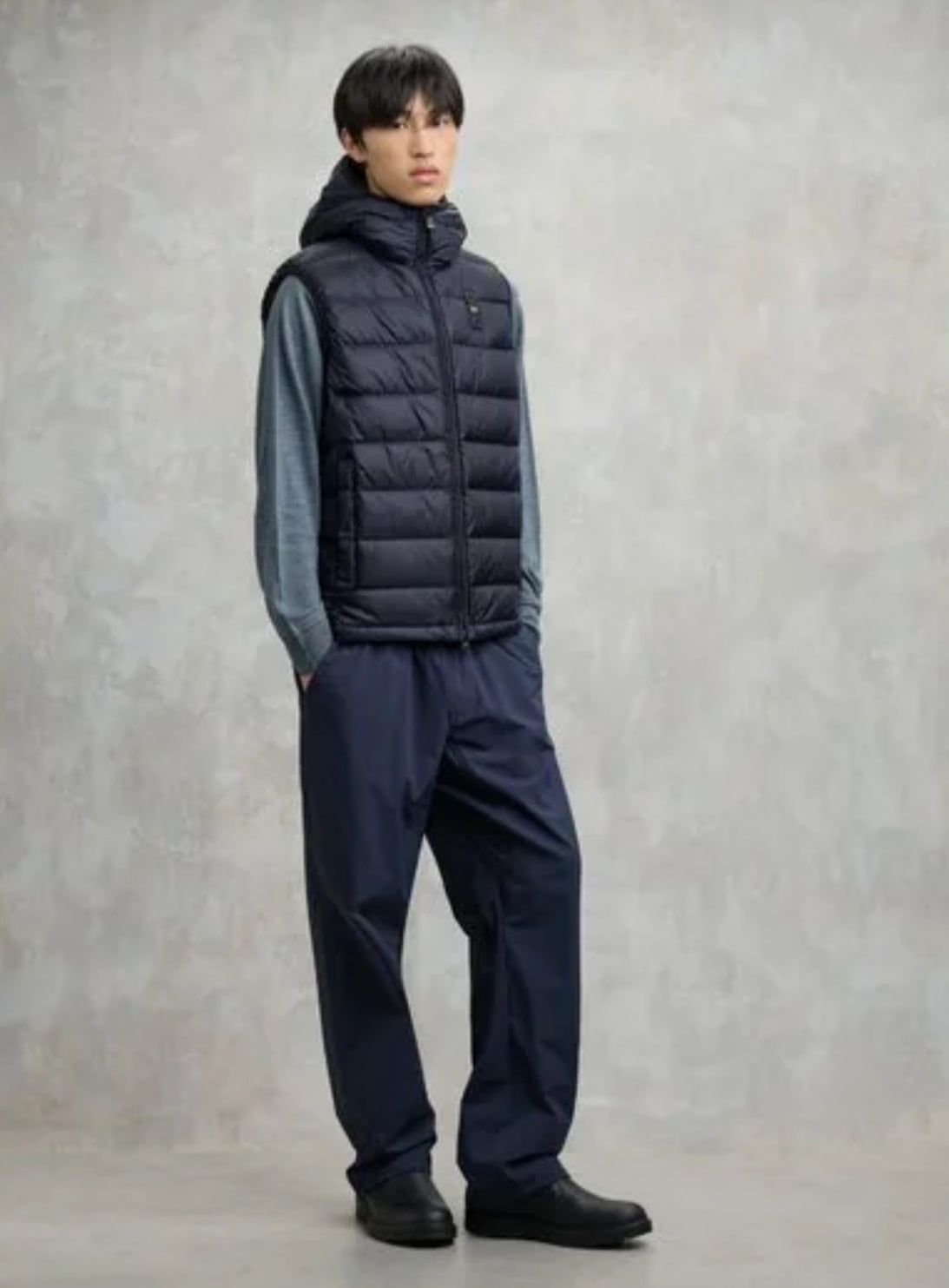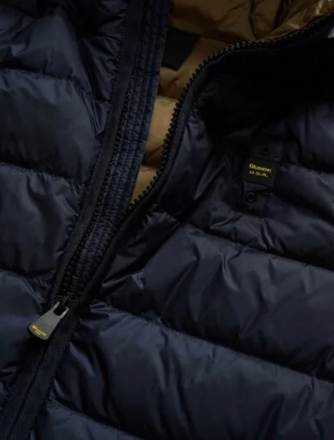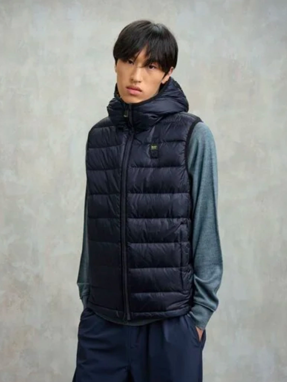 Piumino uomo senza maniche con cappuccio trapuntato a righe orizzontali. Capo iconico Blauer con imbottitura naturale in piuma, calda e non ingombrante; dedicato a chi vuole essere comodo e alla moda in ogni occasione.