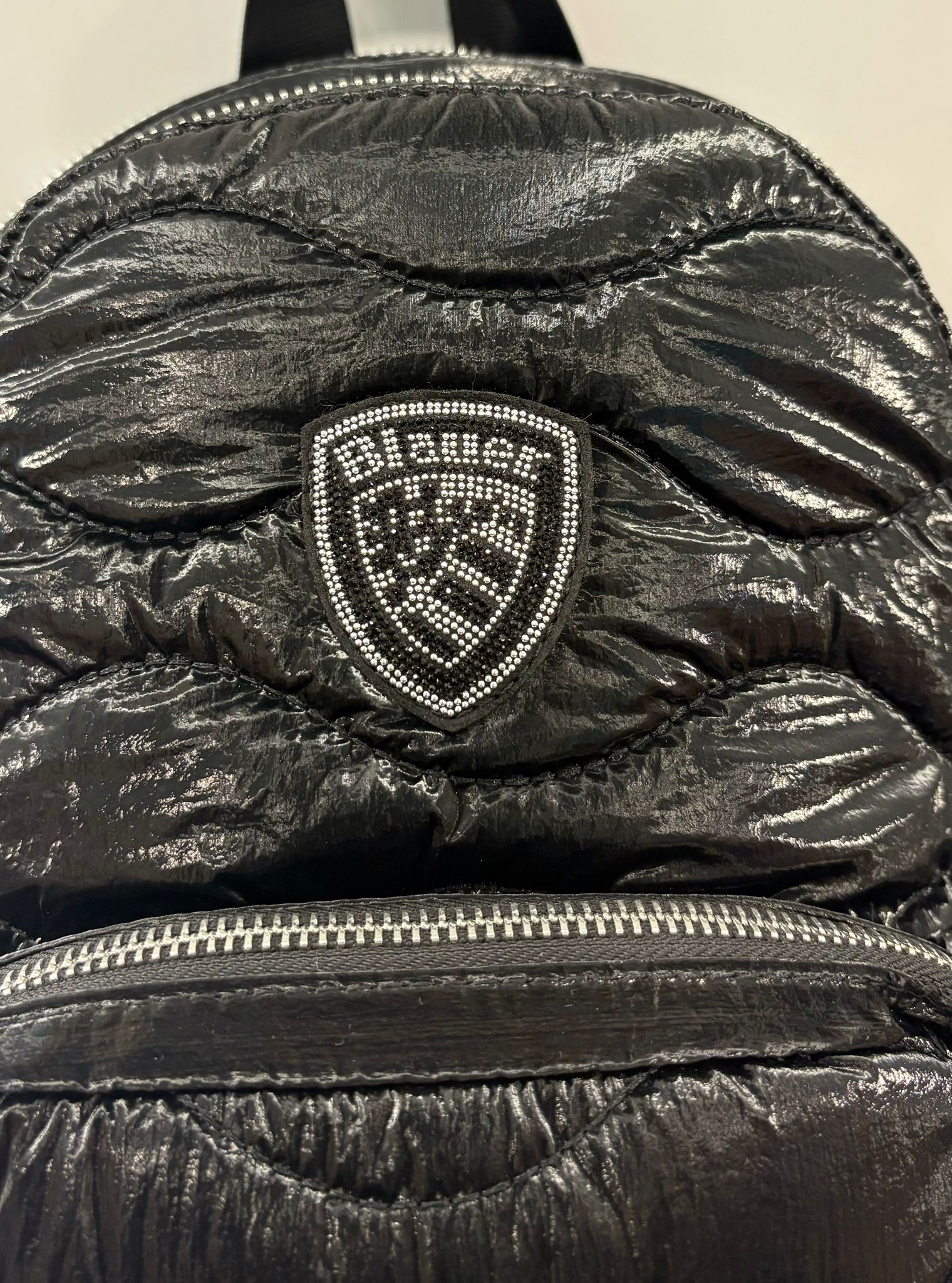 Zaino Blauer nero piumino ad onde Backpack WAVE03. Questa borsa ad onde Blauer ha il manico per il trasporto a mano, tre chiusure zip around, le bretelle regolabili e il patch del brand sul davanti con strass. Il primo scomparto grande di questo Zaino Blauer è composto da due tasche con cerniera, è molto ampio e capiente.